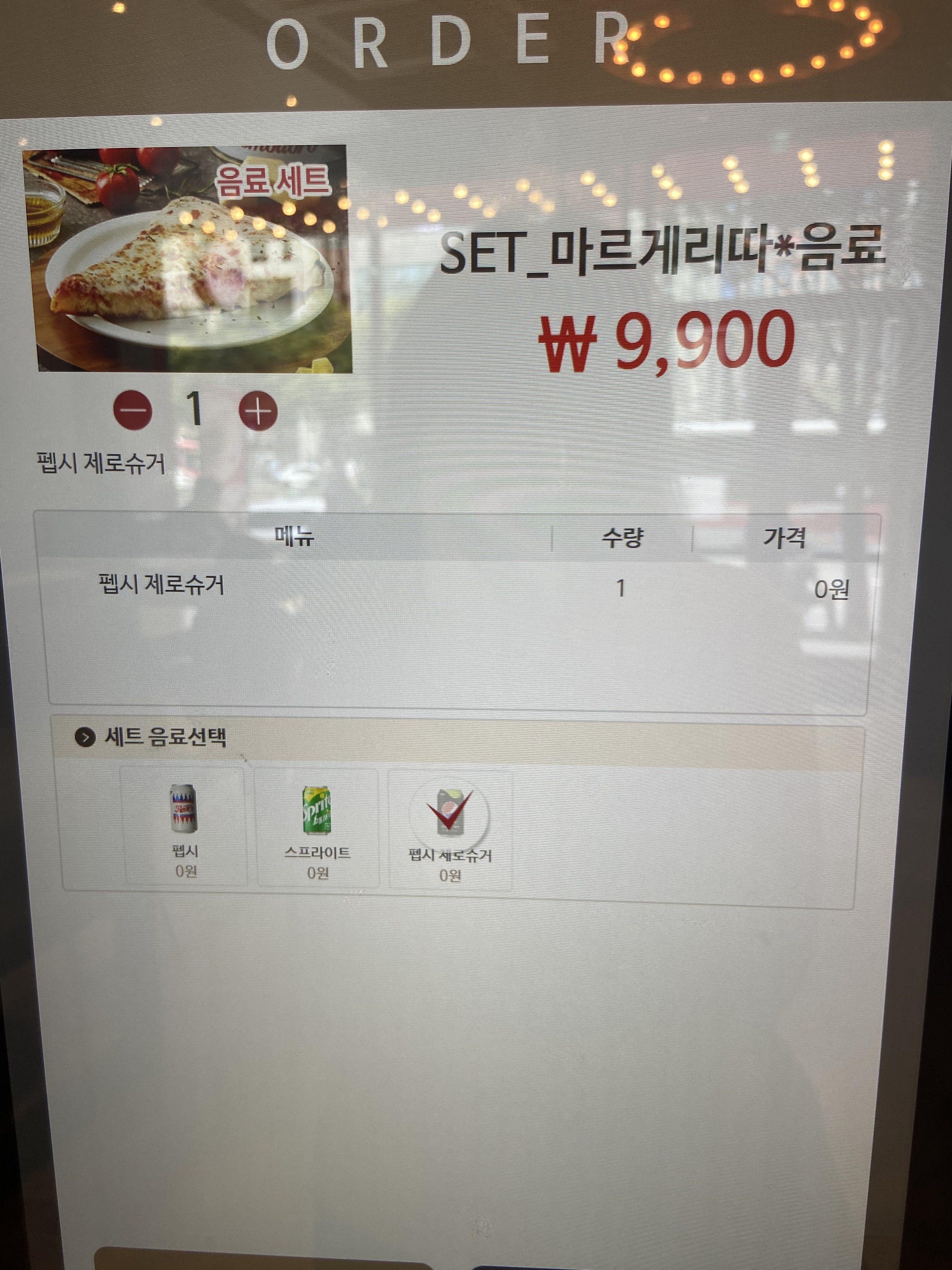 나는 마르게리따와 제로 슈거 펩시를 주문했다. 마르게리따 한 조각과 음료 세트는 9,900원. 거의 만 원이다. 피자 한 조각의 가격 치고는 꽤 비싼 편이다.