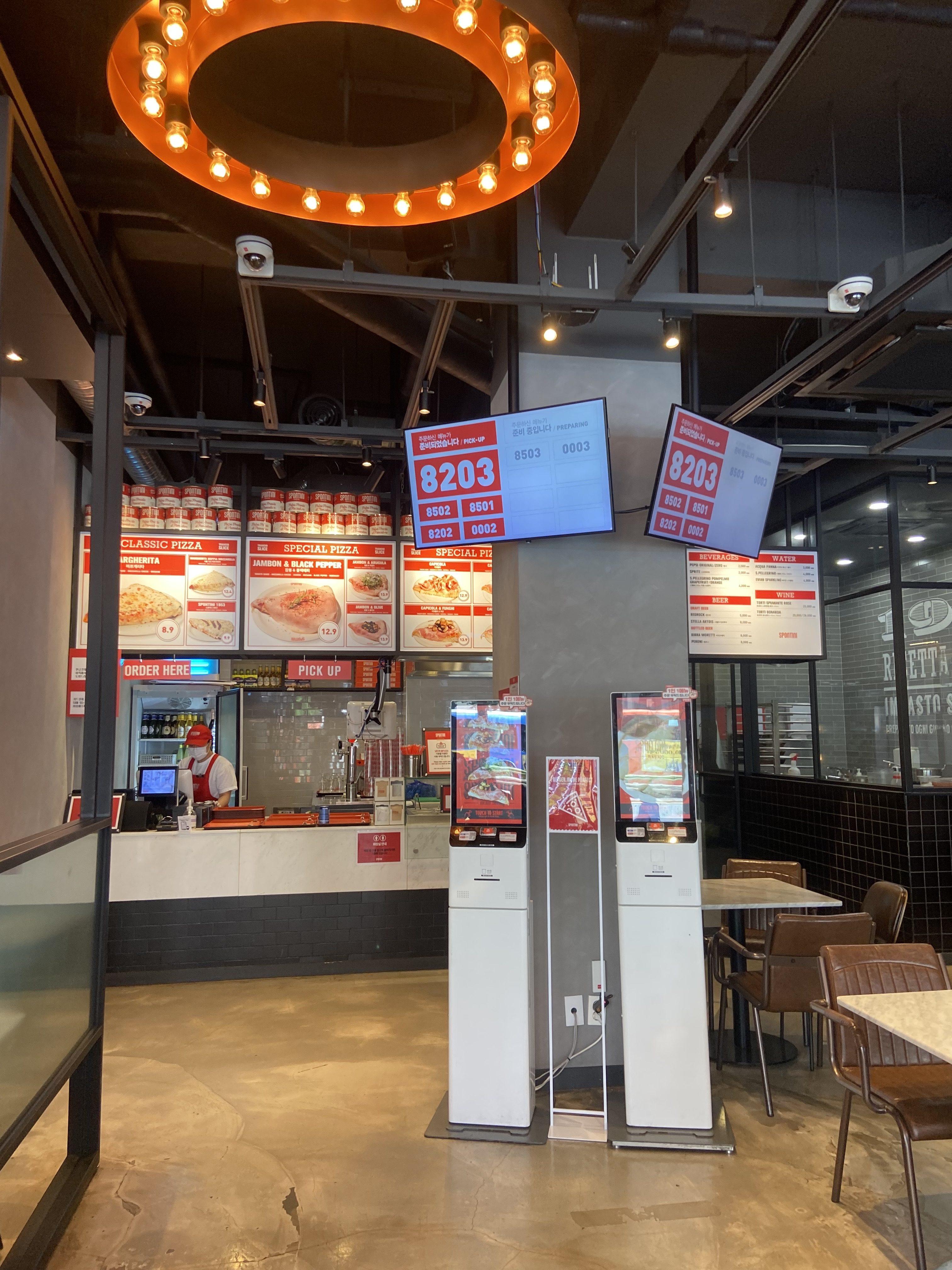 매장 가장 안 쪽에는 주방이, 매장 중간 쯤에는 음식을 주문하는 키오스크가 있다.