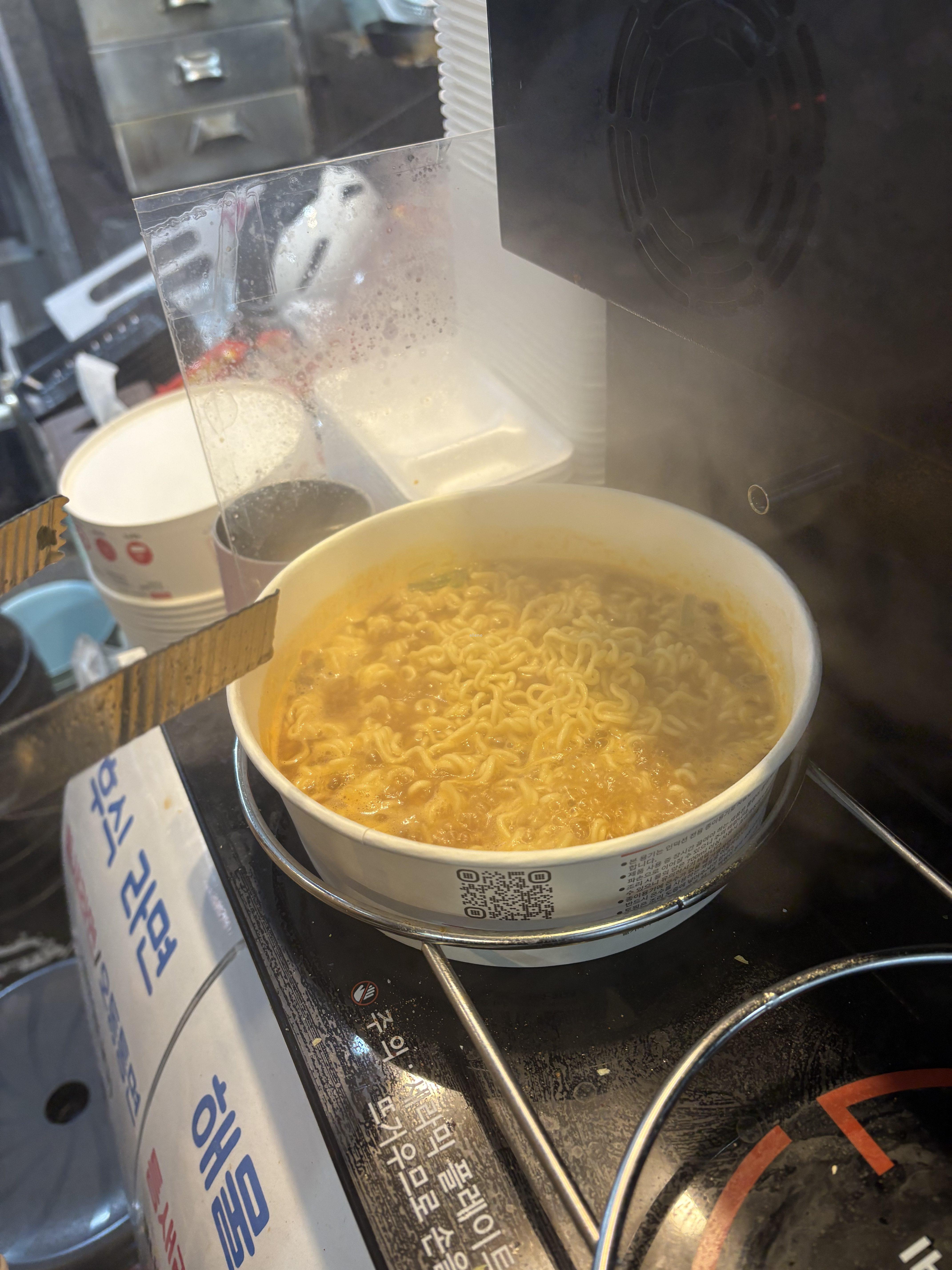 후식 라면은 라면을 사랑하는 남편이 셀프로 끓여왔어요. 한강 편의점같은 곳에서 볼 수 있는 기계를 이용해 끓이는 건데, 아무래도 직접 끓인 라면보단 덜하지만 맛은 있습니다. 회를 먹고 느끼해진 입을 개운하게 바꾸기 딱이에요.