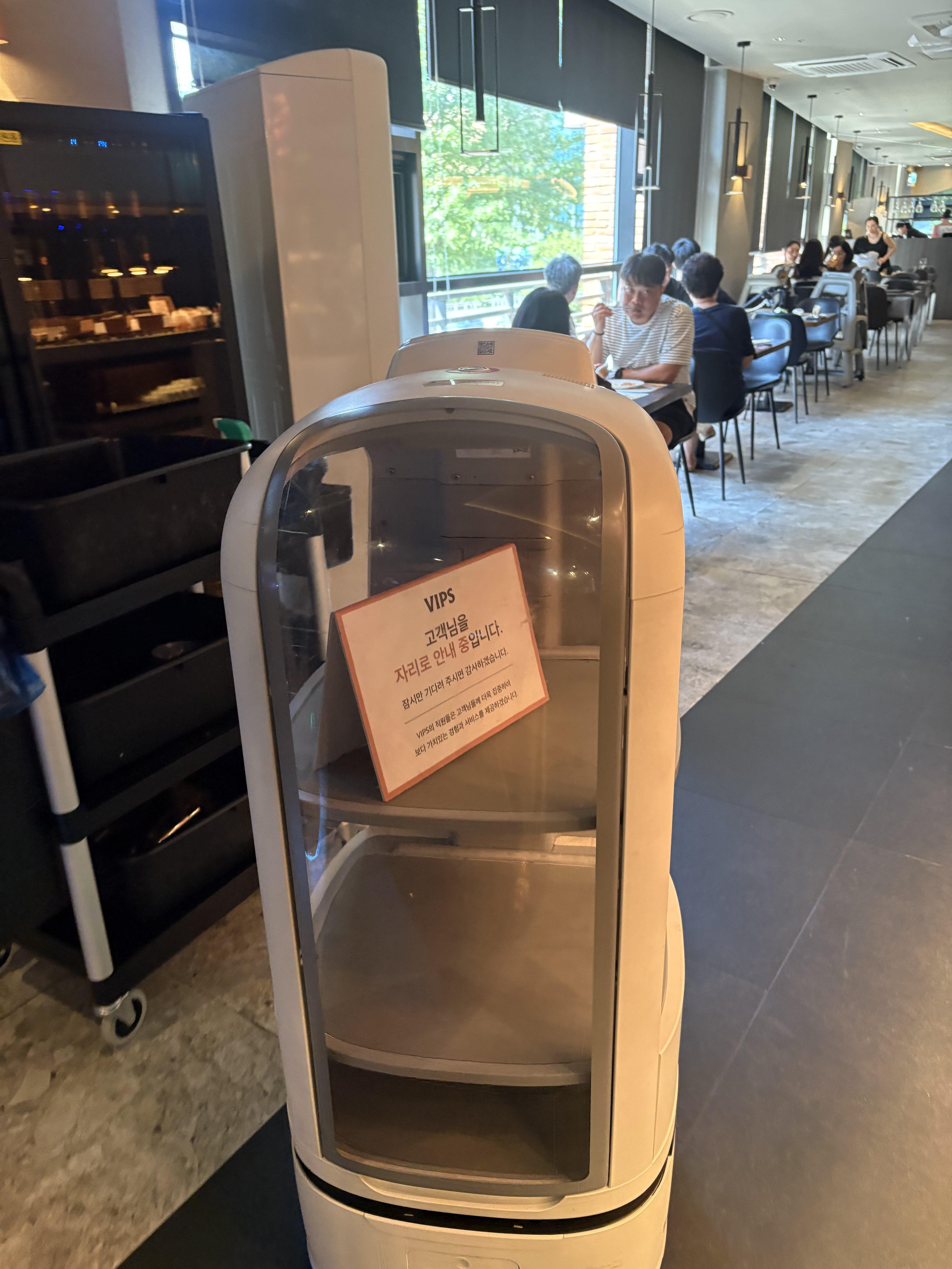 전혀 선진화되지 않은 로봇..요즘 나오는 로봇은 진짜 내 자리까지 안내해주는데 이 아이는 한 중간정도까지 가고 멈춰서네.