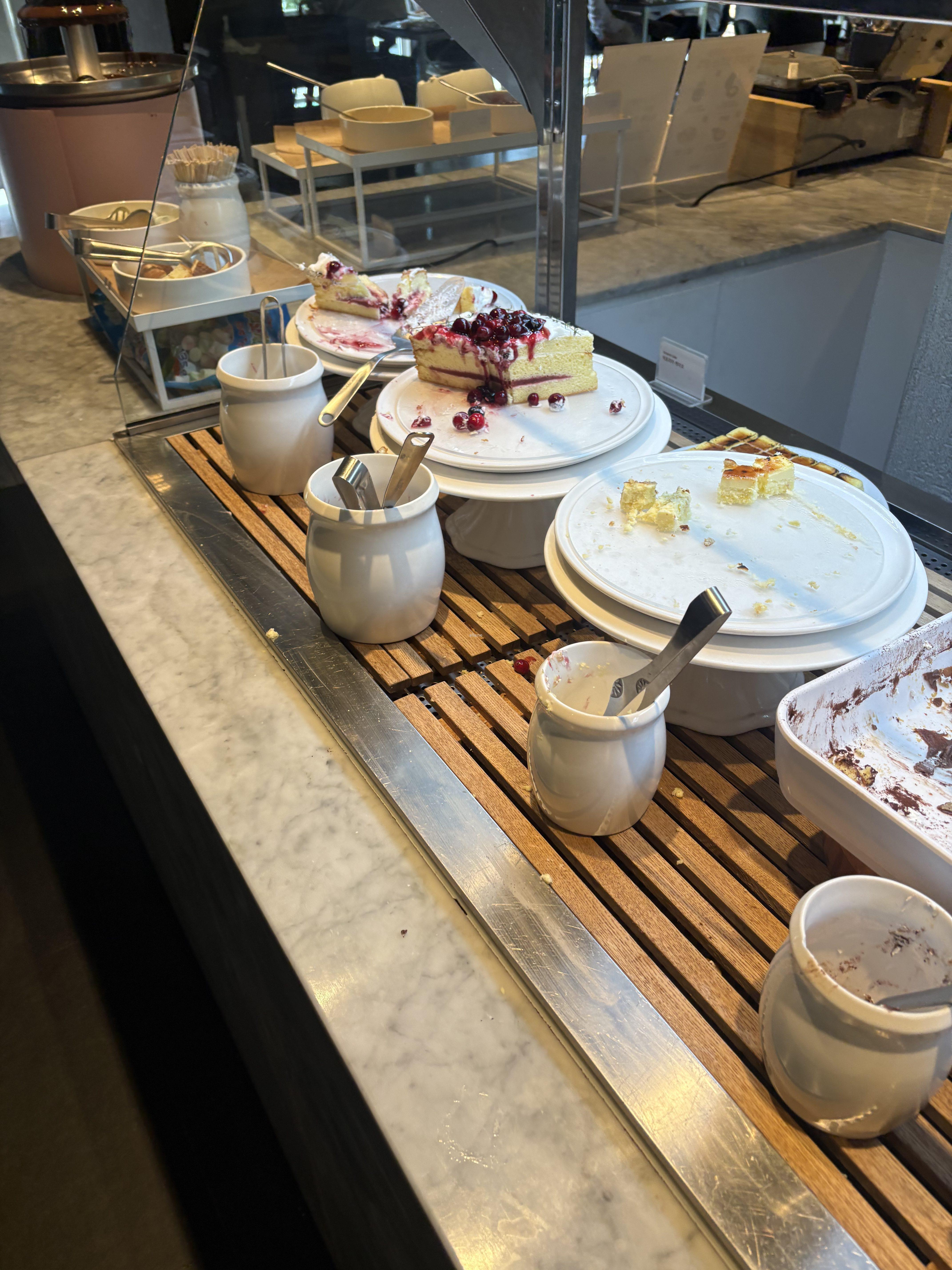 디저트는 리치, 자몽같은 과일부터 3-4 종류의 케이크, 아이스크림, 커피, 초코분수, 와플 등이 있다.
