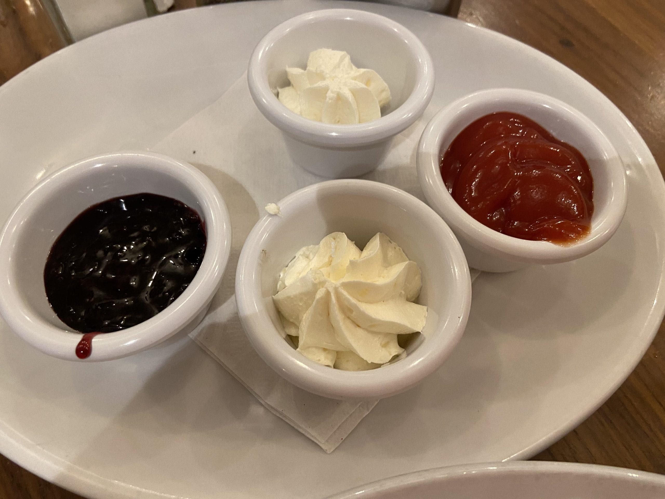 기본으로 나오는 잼 옵션 보소.. 빵조각도 웬만한 식빵보다 큰데, 이걸 찍어먹을 잼도 무려 네 가지가 나온다.