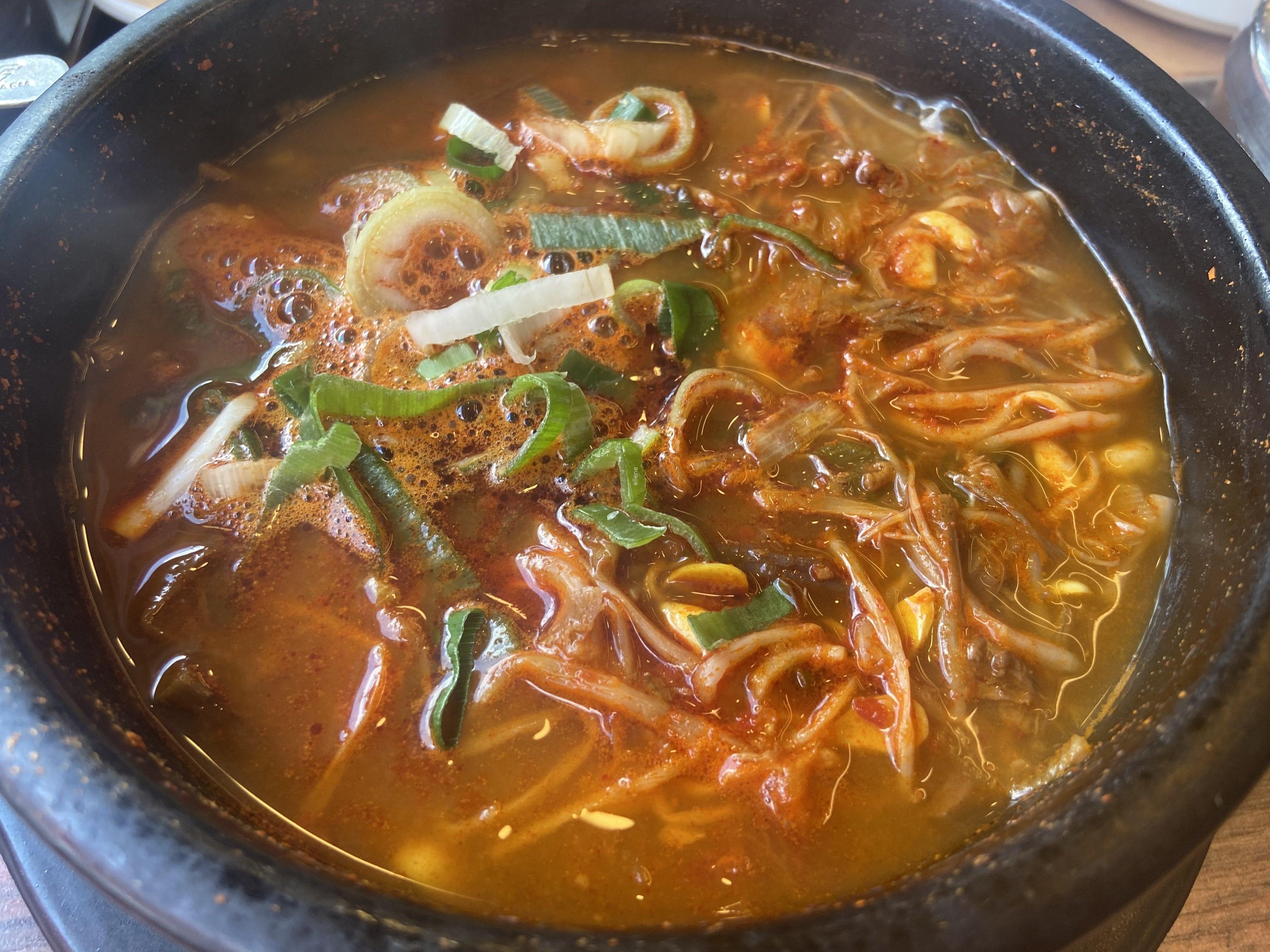 소고기국밥도 마찬가지로 뚝배기에 담겨 펄펄 끓고 있는 채로 제공됐다. 국밥 안에 콩나물, 고기, 야채, 파, 그리고 밥이 들어있다.