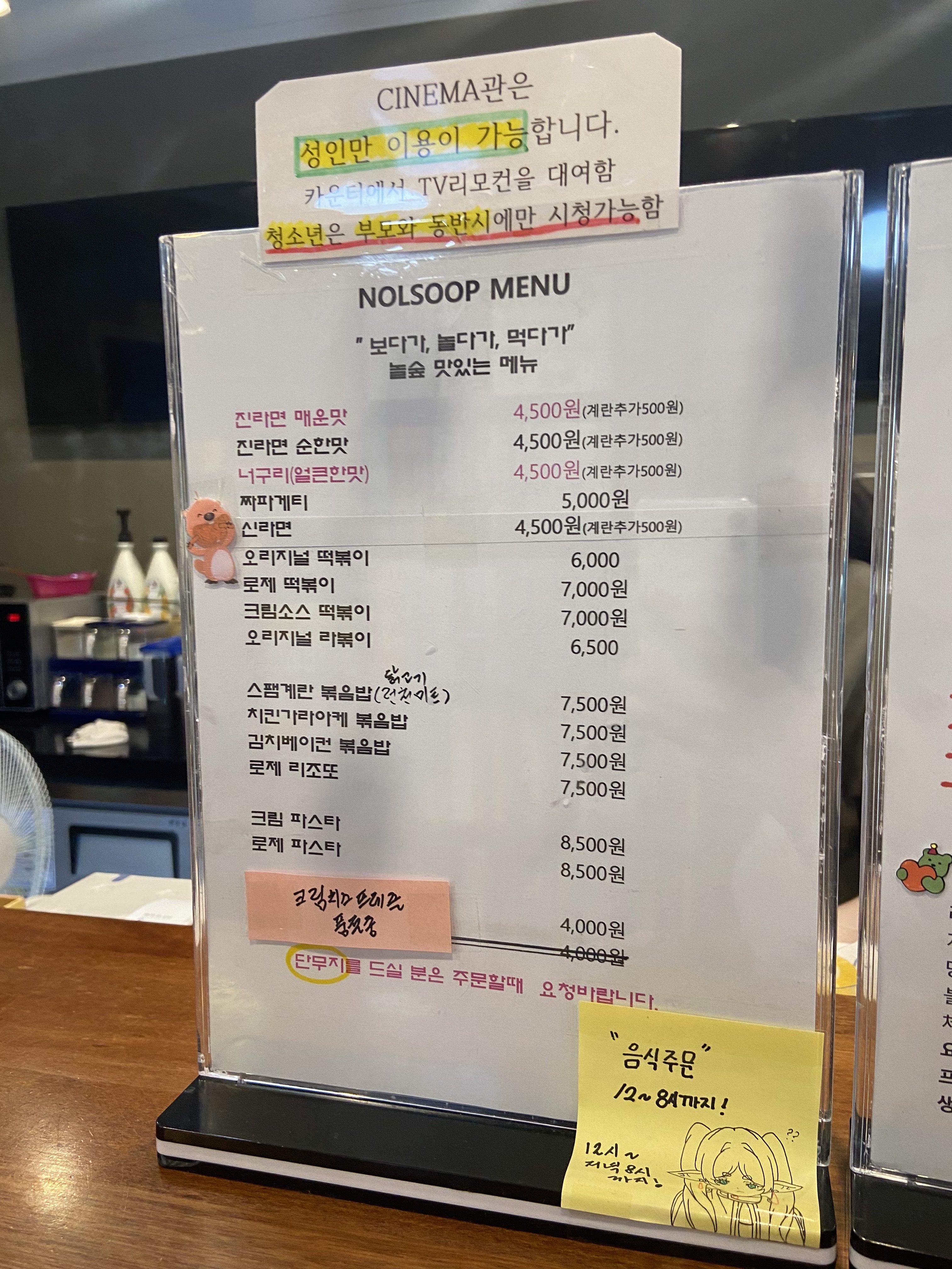 떡볶이, 짜장볶음 등 만화책과 잘 어울리는 음식도 판매하고 있었어요. 결혼 전 데이트할 때 강남역에 있는 놀숲에서 떡볶이랑 짜장볶음을 주문해먹곤 했는데, 맛이 꽤 좋았던 것으로 기억해요.