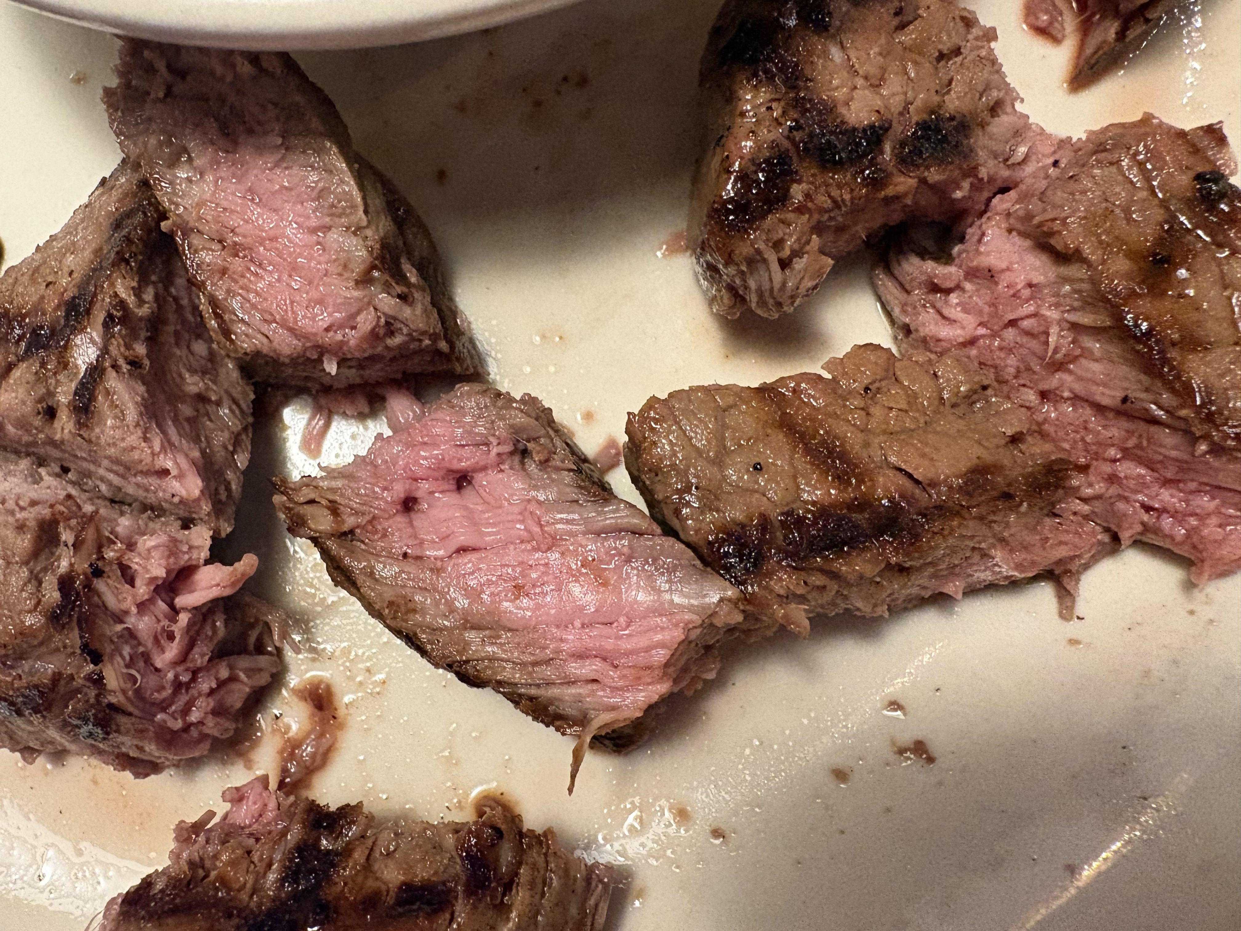 네.. ㅎㅎ 적당히 구워졌네요. 스테이크 겉면은 잘 익었고, 안 쪽은 핑크빛이 나요.
