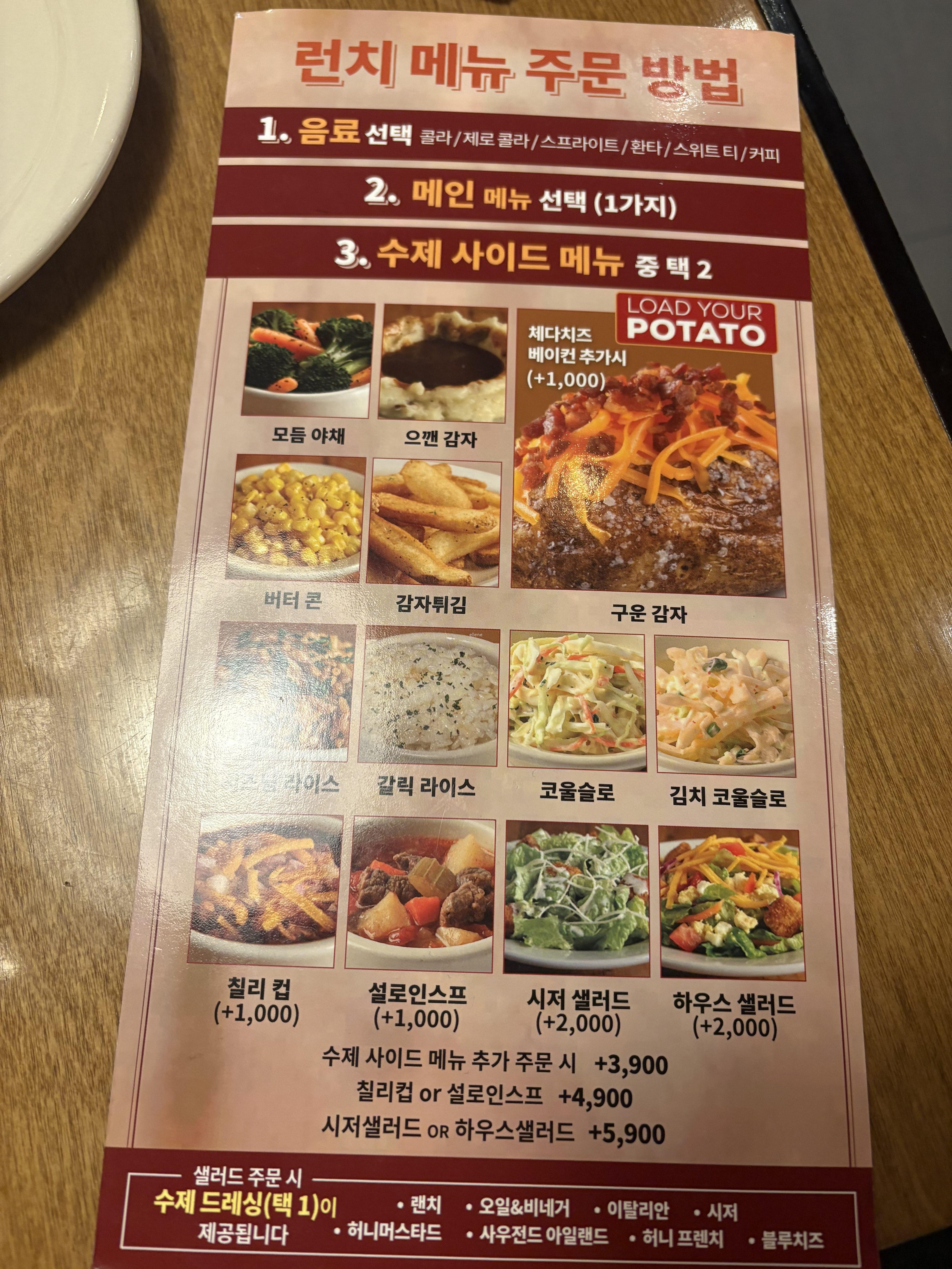 텍사스로드하우스의 런치세트는 구성이 꽤 괜찮아요. 메인메뉴 하나, 음료 하나, 사이드메뉴 두 개로 구성되어있거든요.