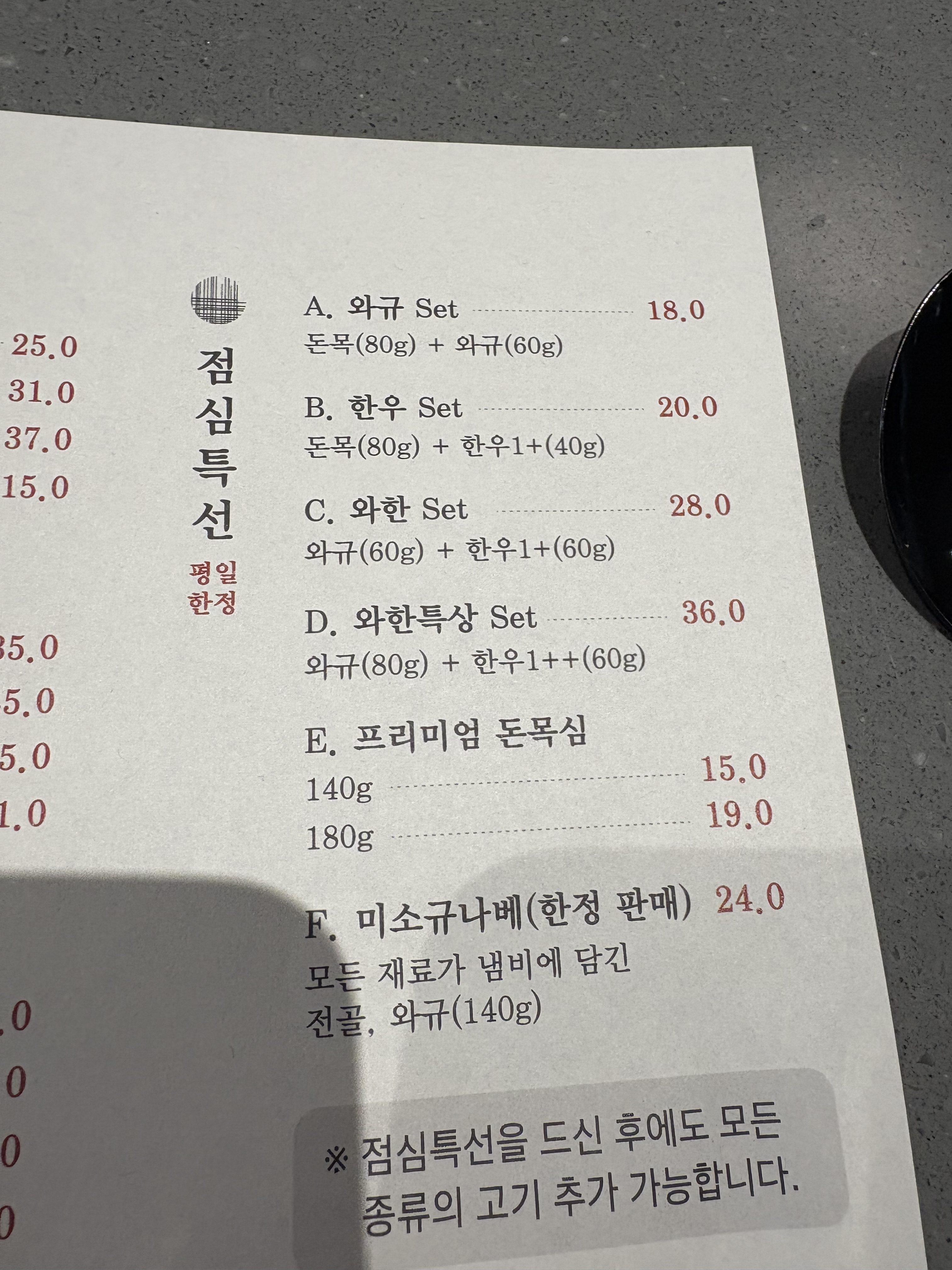 점심 특선으로는 와규세트 / 한우세트 / 와한세트 / 와한특상세트 등이 있고,