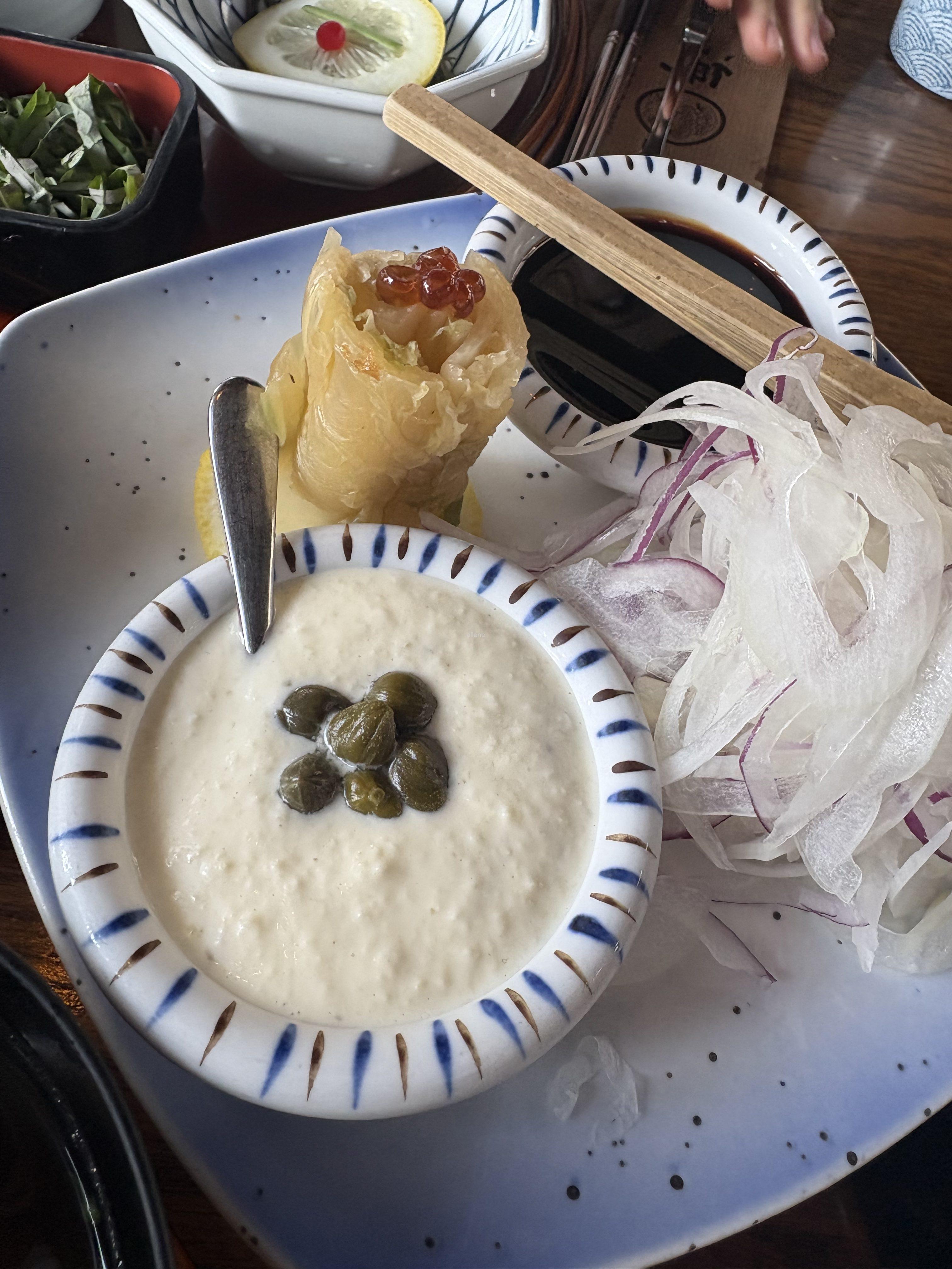 함께 먹을 여러 반찬들도 함께 나옵니다. 장아찌, 젓갈같은 고명, 디저트도 한 입거리씩 예쁜 그릇에 담겨 제공되었어요.