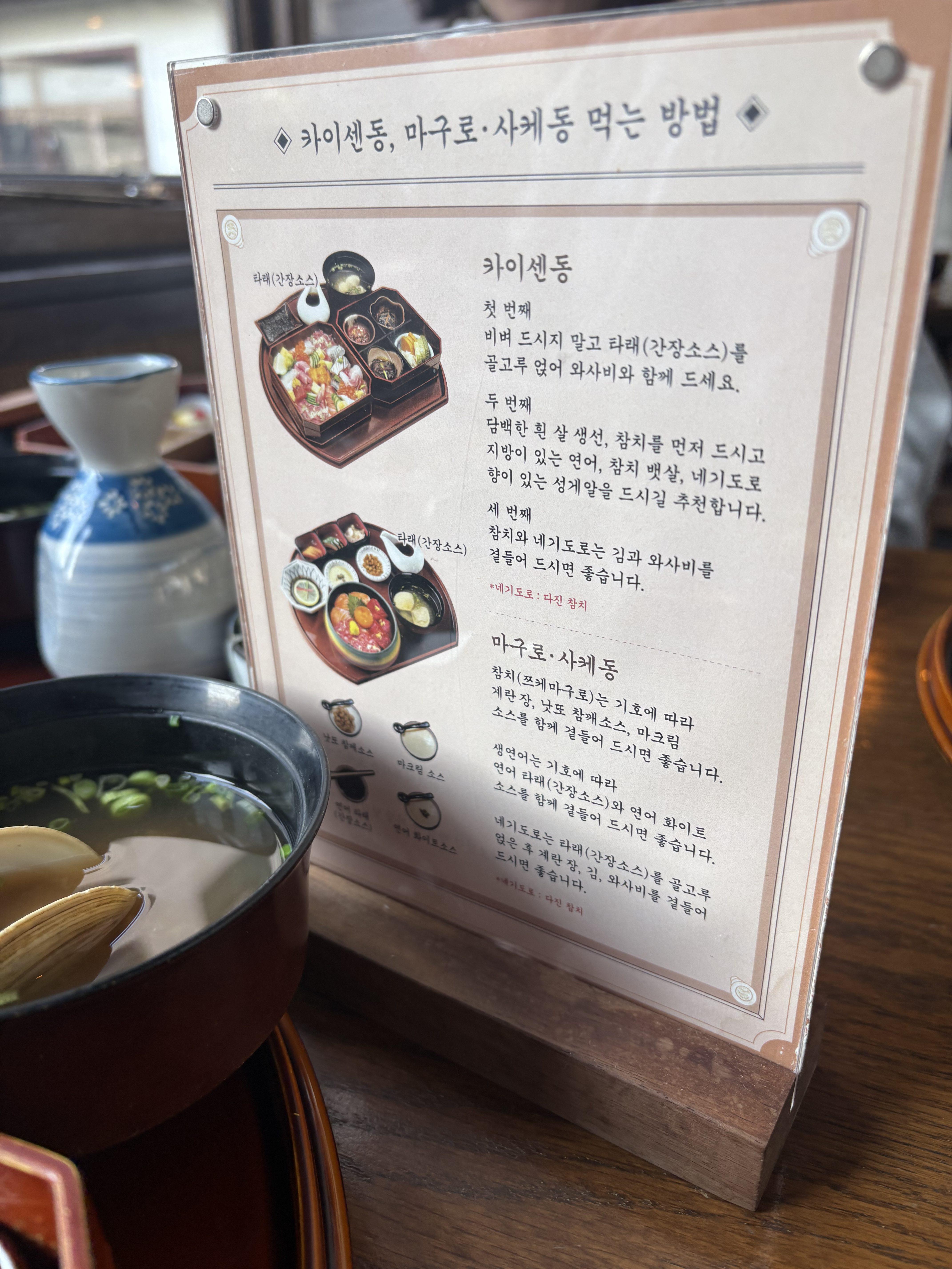 테이블마다 장어덮밥과 카이센동 등을 맛있게 먹는 방법이 적혀있더라고요.