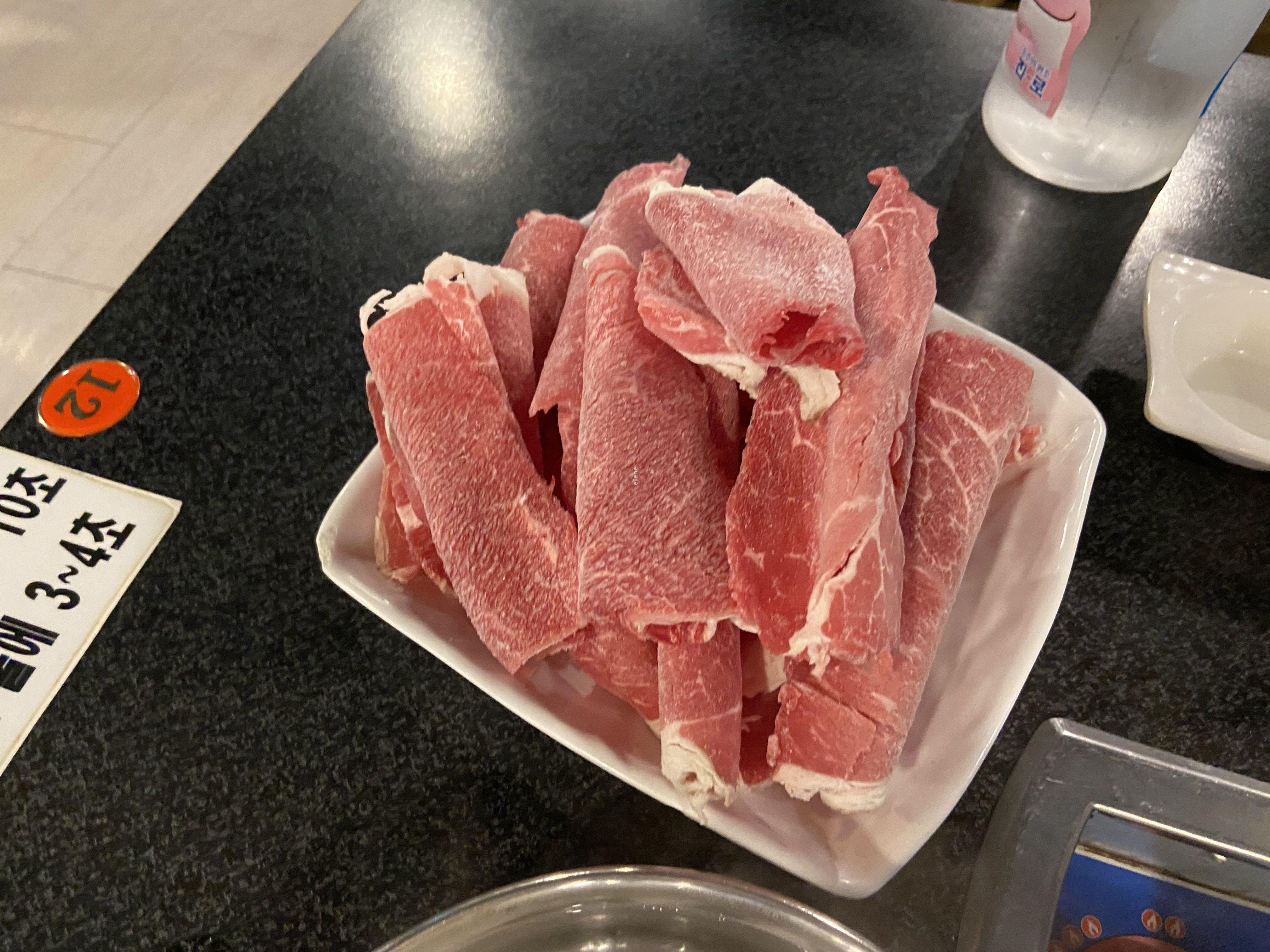 가장 먼저 팟에 고기를 넣어 야채와 고기를 끓여먹었다. 고기는 냉동이어서 그런지 약간 질겼다. 하지만 뭐, 고기 무한리필이니까 퀄리티는 다소 아쉬울 수 있다고 생각한다.