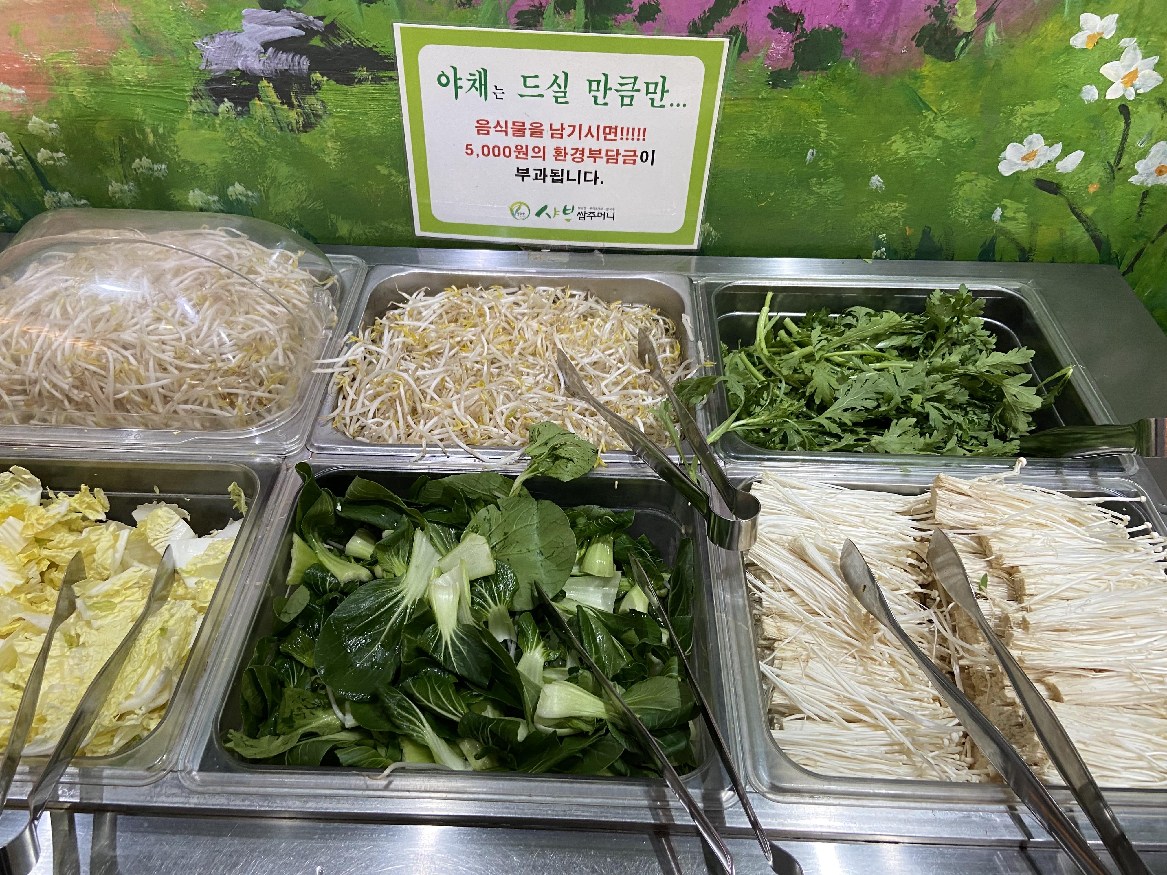 테이블에 있는 인덕션 위에 팟을 올린 다음, 샤브가 끓기를 기다리며 가게 한 쪽에 위치한 샐러드바에 가봤다.