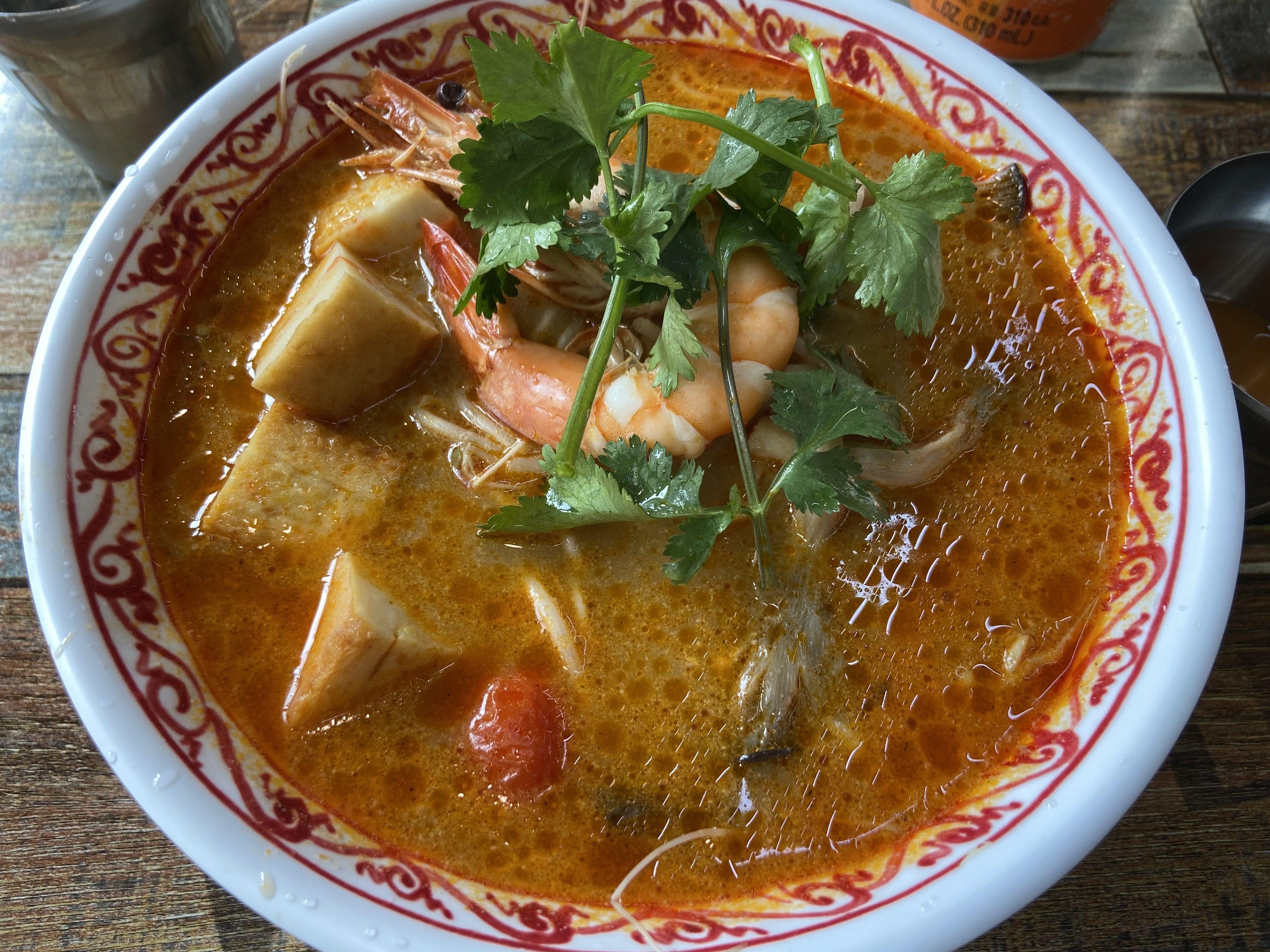 똠양쌀국수는 빨간 똠양꿍 베이스의 국물에 삶은 면을 넣은 쌀국수다. 똠양꿍을 좋아하는 분이라면 무난하게 드실 듯.