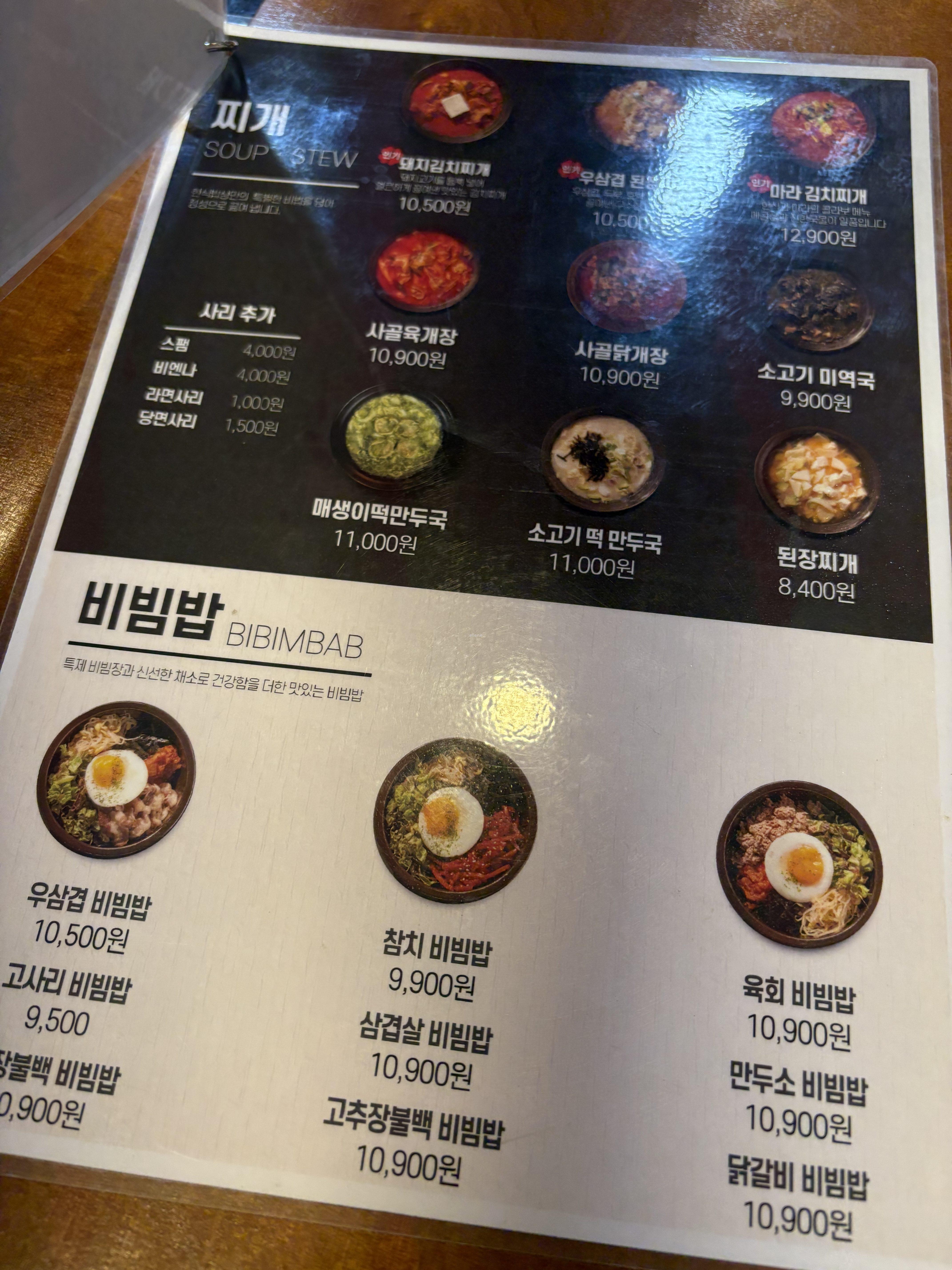 메뉴는 다양한 한식으로 구성되어있고, 비빔밥을 비롯해 찌개류, 국류 등이 마련되어있어요.