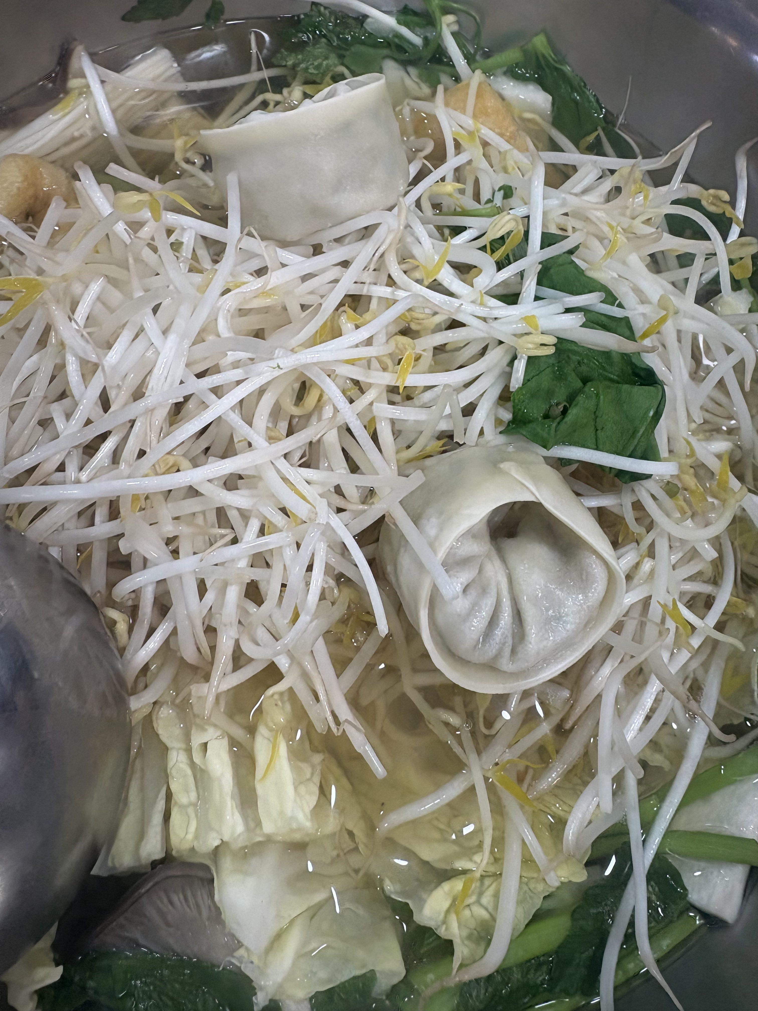 야채는 콩나물이 진짜 산처럼 쌓여있다. 그리고 칼국수 조금과 만두 네 알도 들어있다.