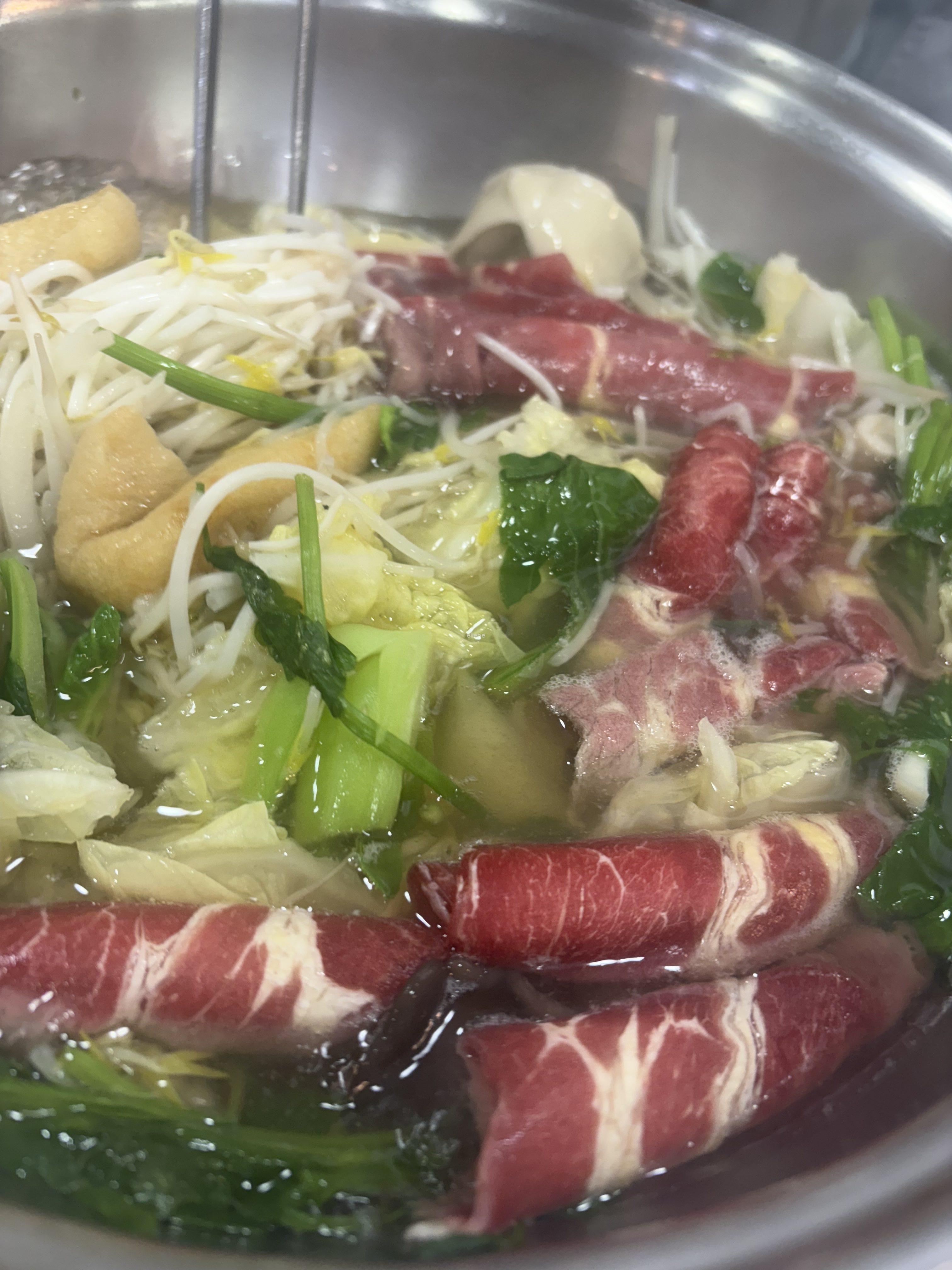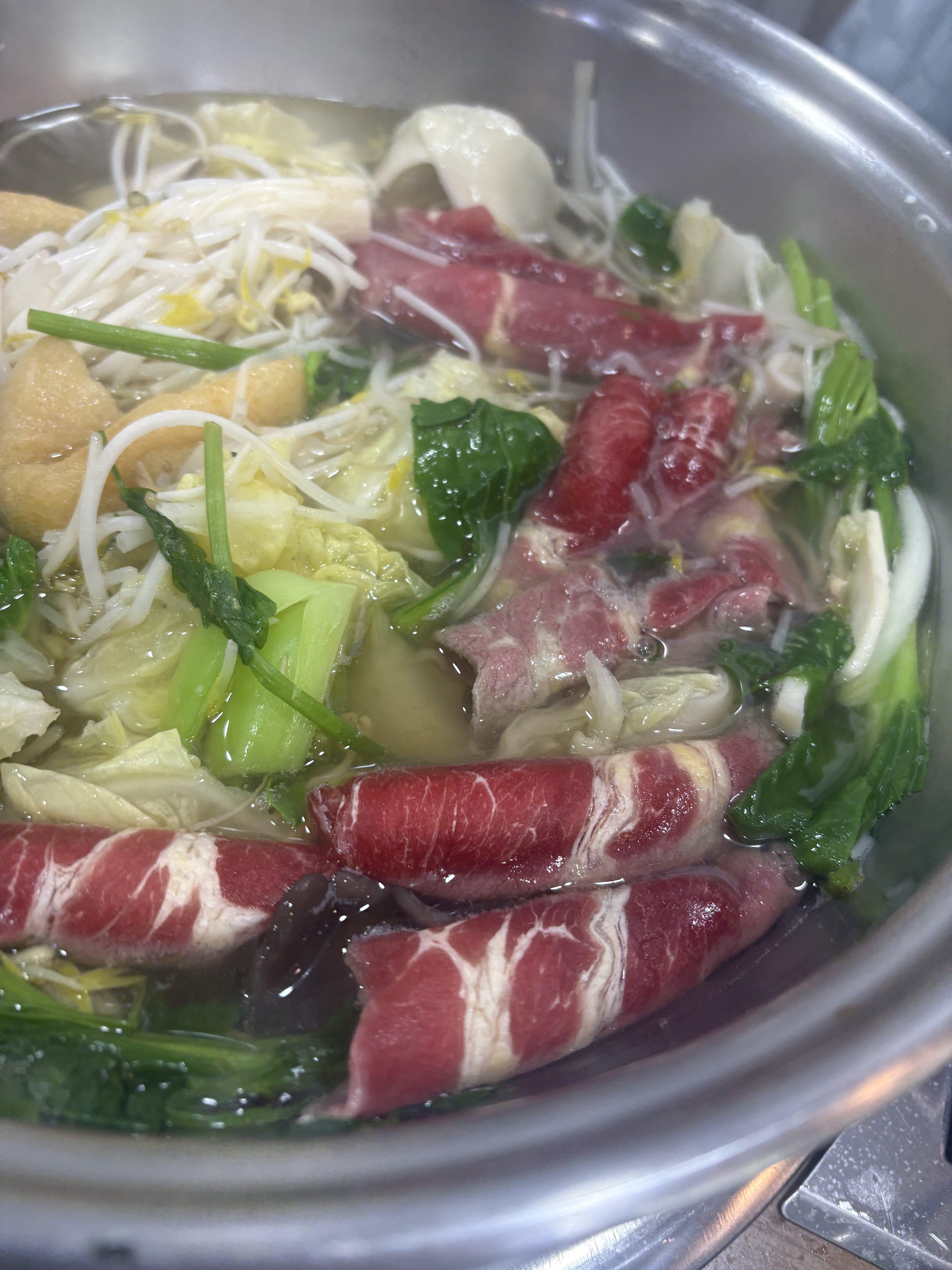 다음, 샤브샤브용으로 제공된 고기도 다 넣었다. 야채에 비해 고기 양은 얼마 되지 않기 때문에 한꺼번에 넣어도 큰 무리는 없다.