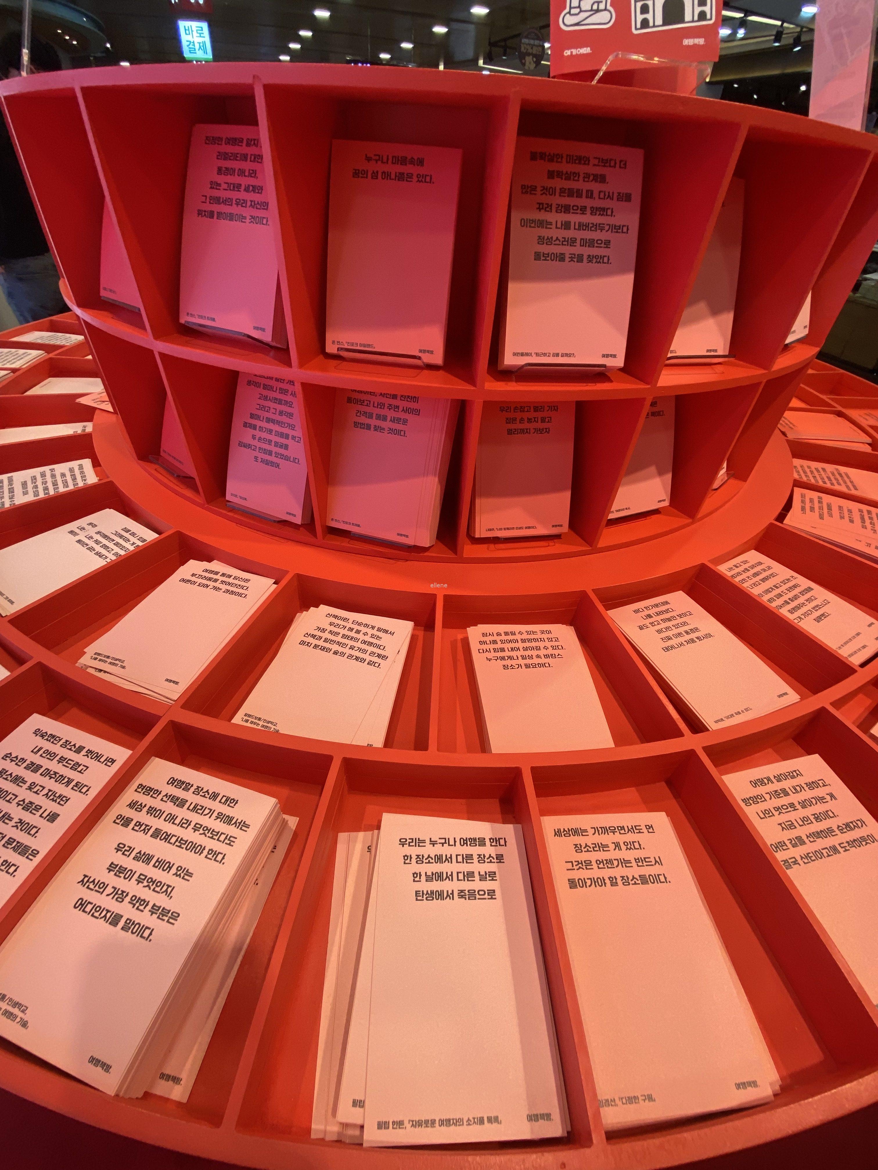 이벤트 코너 뒤쪽에 문구가 지속적으로 바뀌는 디스플레이가 설치되어있어 여행 책방을 찾기는 어렵지 않다.