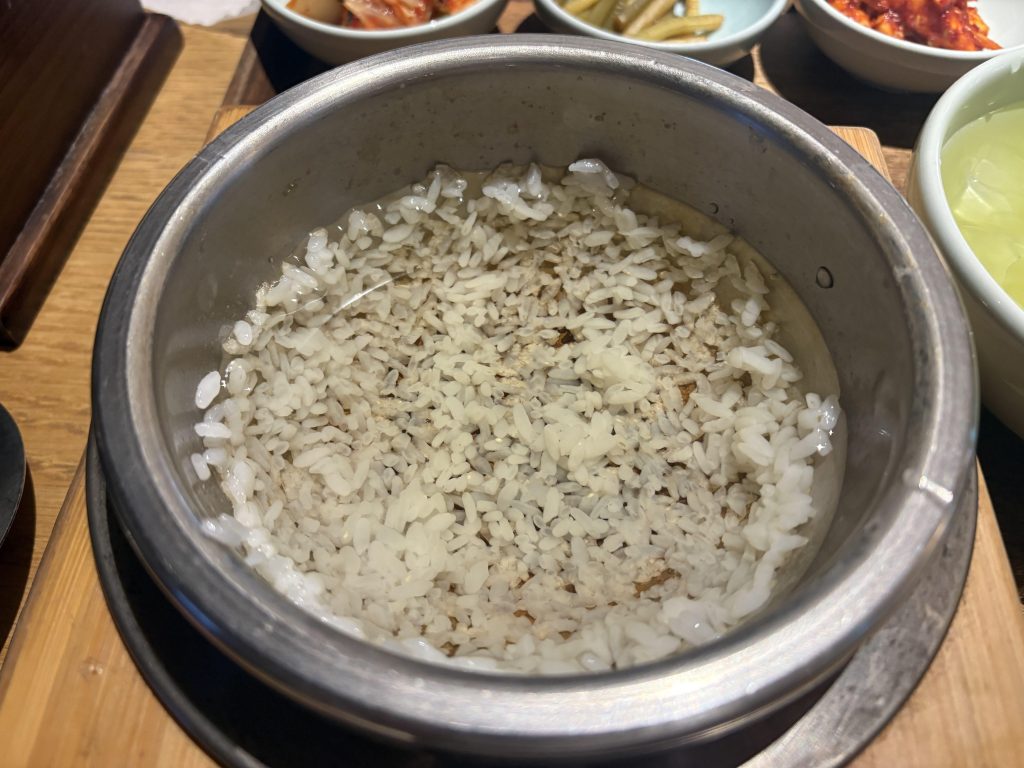 이 밥을 함께 제공된 밥그릇에 덜어내고, 솥에 테이블에 있던 따뜻한 물을 붓는다.