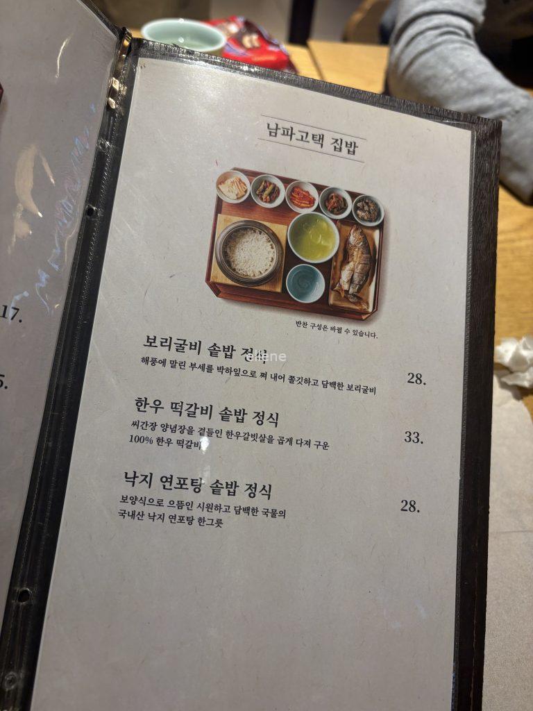 남파고택은 한정식 집 답게 연포탕, 떡갈비, 보리굴비 등 전형적인 한식 메뉴가 준비되어있다.