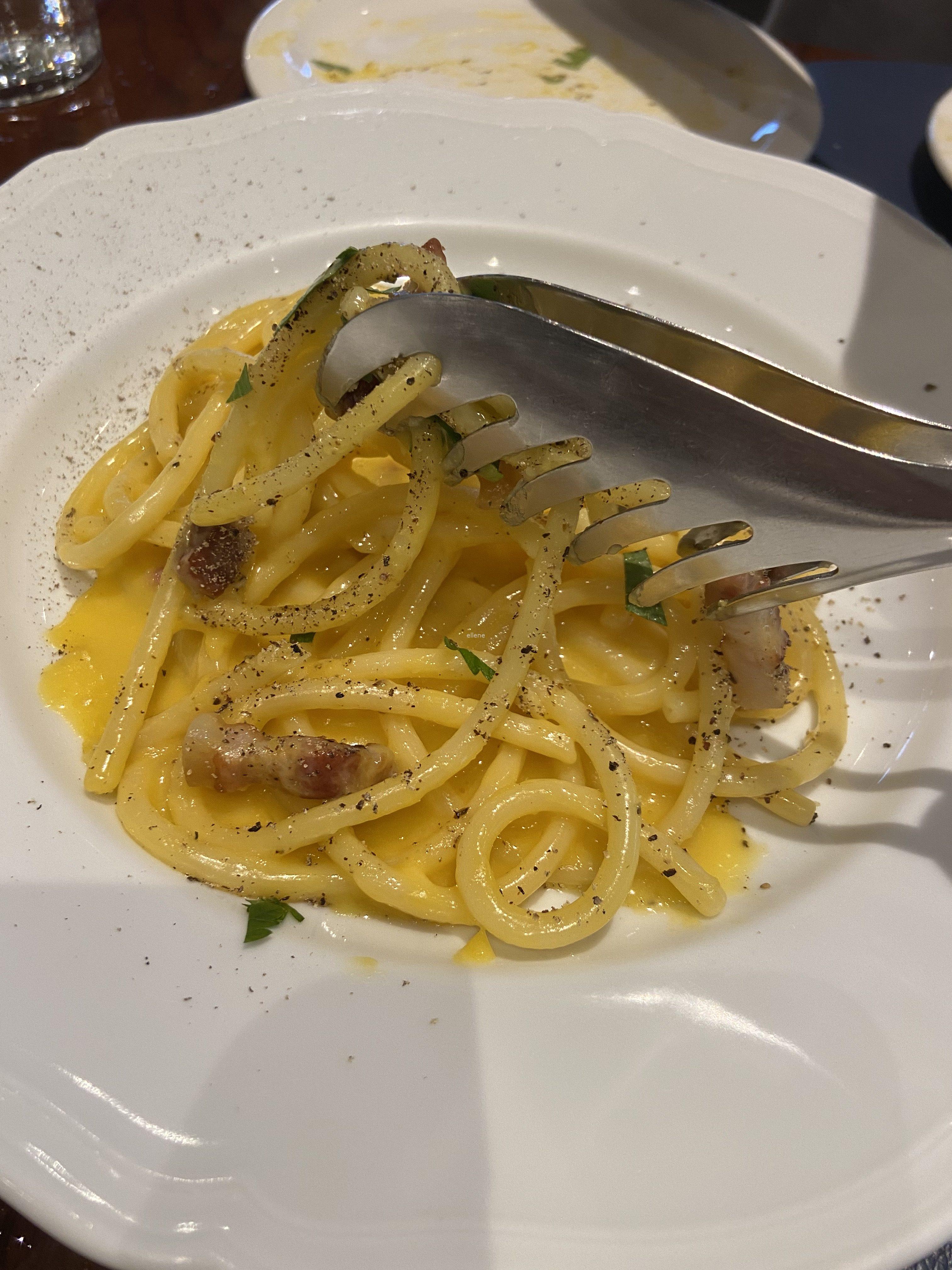 그래도 맛은 정말 고소하고 맛있었어요. 계란 노른자를 주로 활용해 맛을 내다보니 정말 풍미가 좋더라고요. 코딱지만한 베이컨도, 위에 뿌린 시즈닝도 먹을만 했어요. 🙂