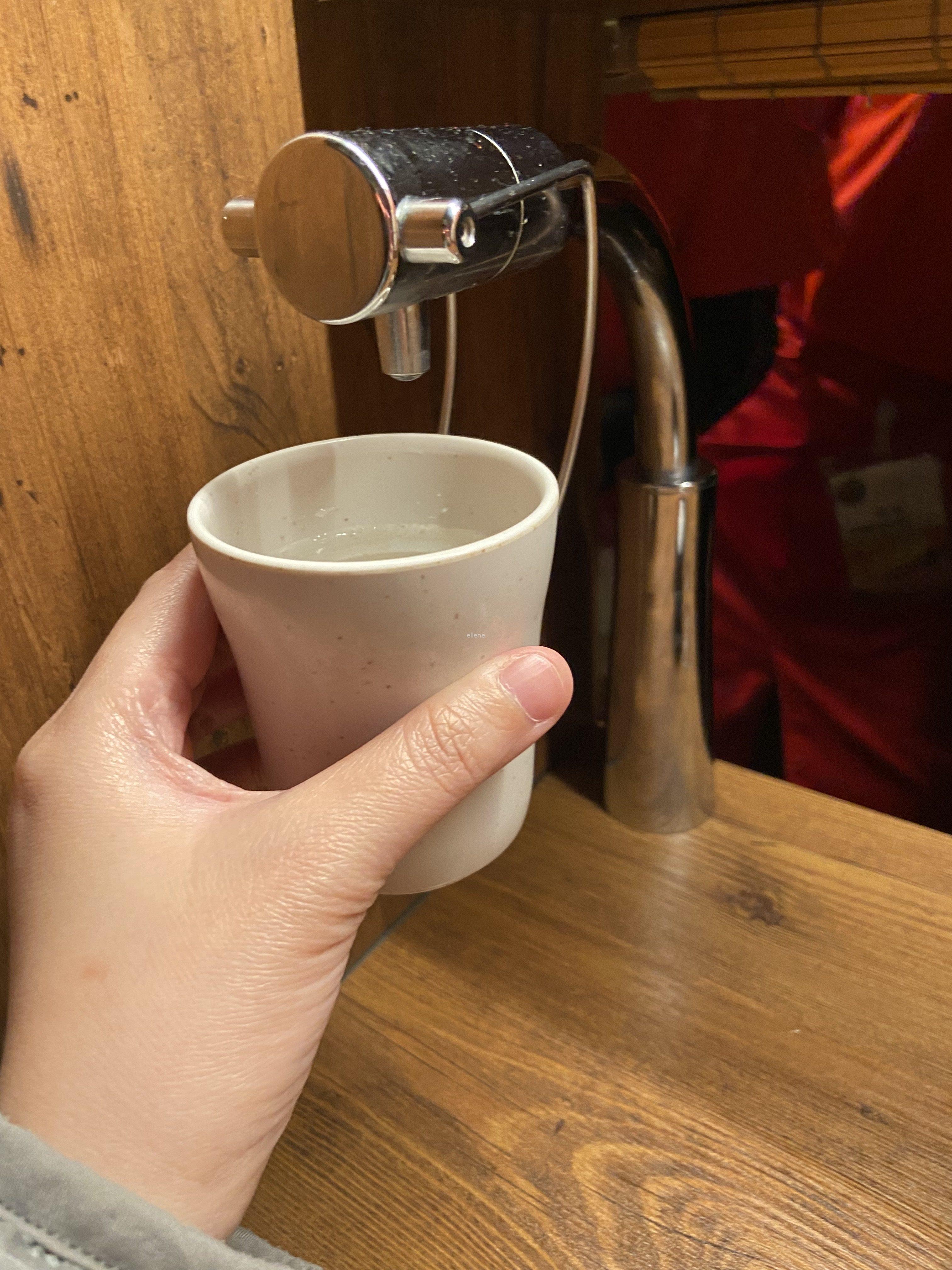 자리마다 물을 따라 마실 수 있는 정수기와 컵이 준비되어있어 직원에게 물을 달라고 얘기하지 않아도 되고, 자리를 비울 땐 “잠시 자리를 비웁니다” 라고 표시되어있는 푯말을 자리에 두면 된다.