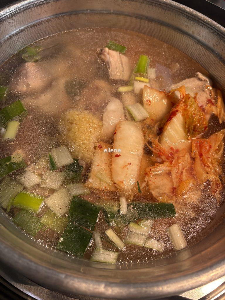 맛있게 익어가는 닭한마리와 김치.