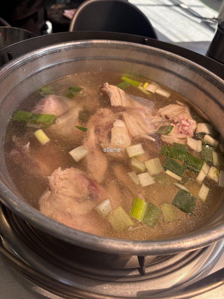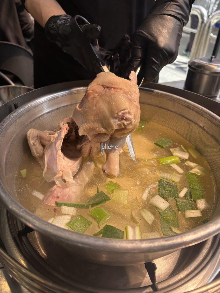 자리에 앉자마자 직원이 생닭 한마리를 가져와 가위로 자른 다음 냄비에 옮겨주셨다.