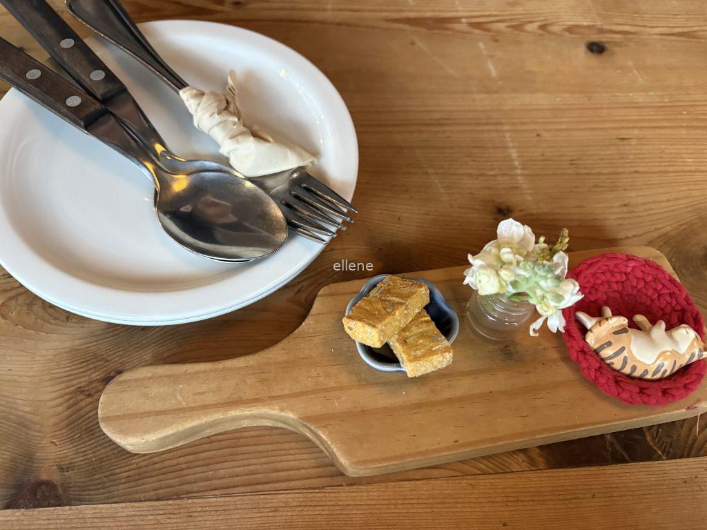 주문하자마자 테이블에 예쁜 장식과 아주 작은 빵조각이 놓였다.
