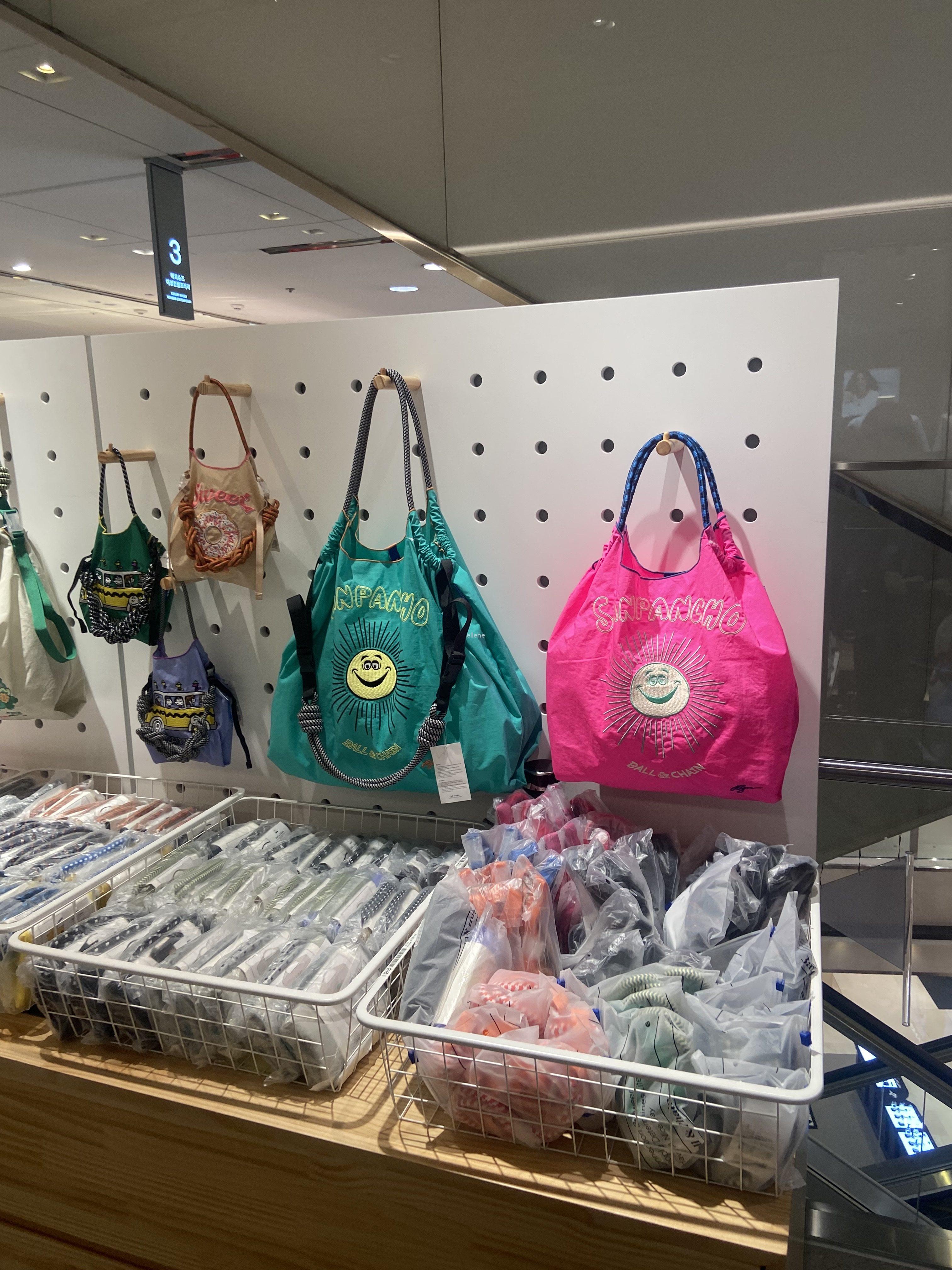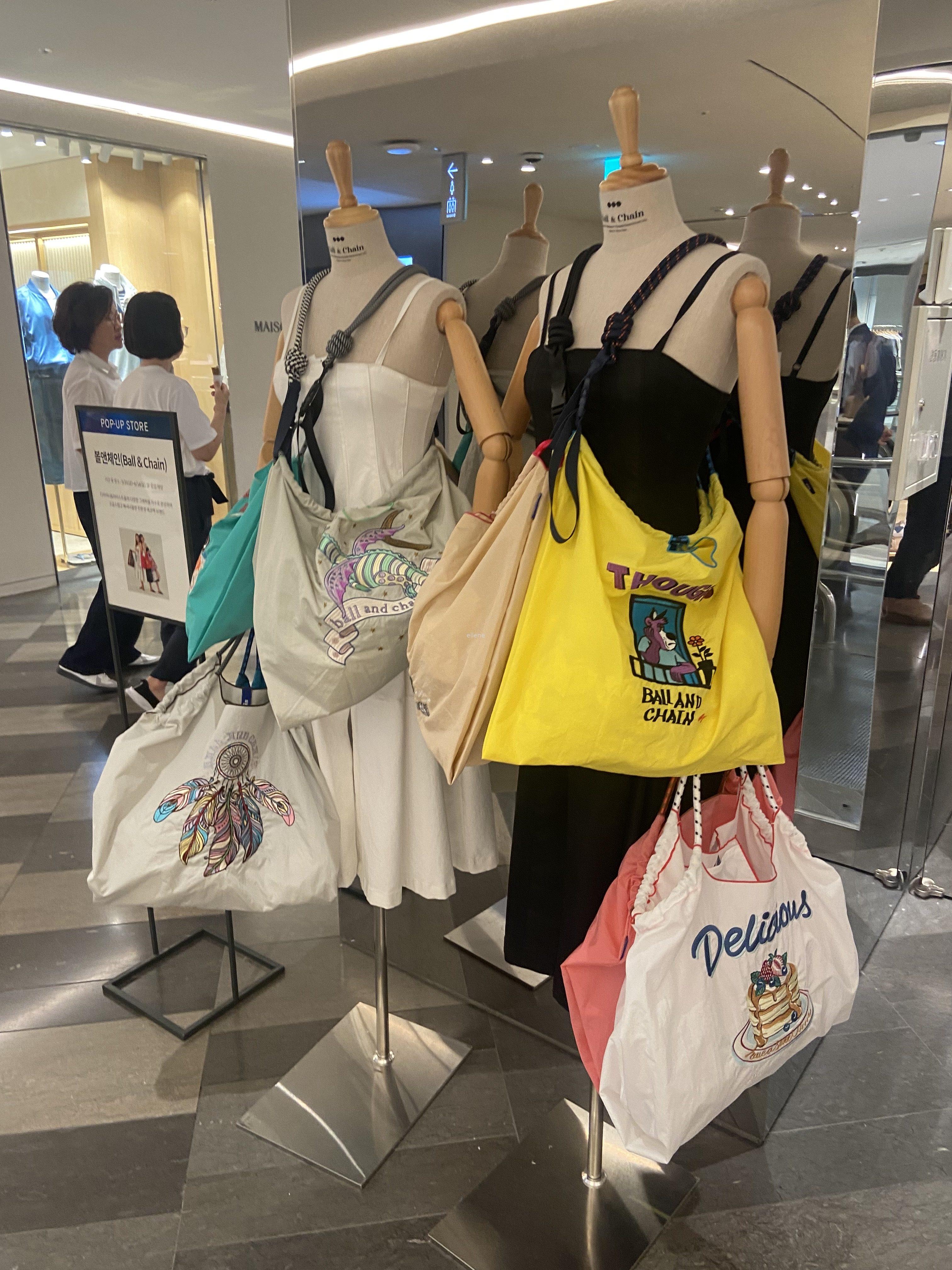 바로 볼앤체인이라는 브랜드의 팝업스토어인데, 가벼워보이는 재질의 에코백들이 너무나도 예뻐 보였다.