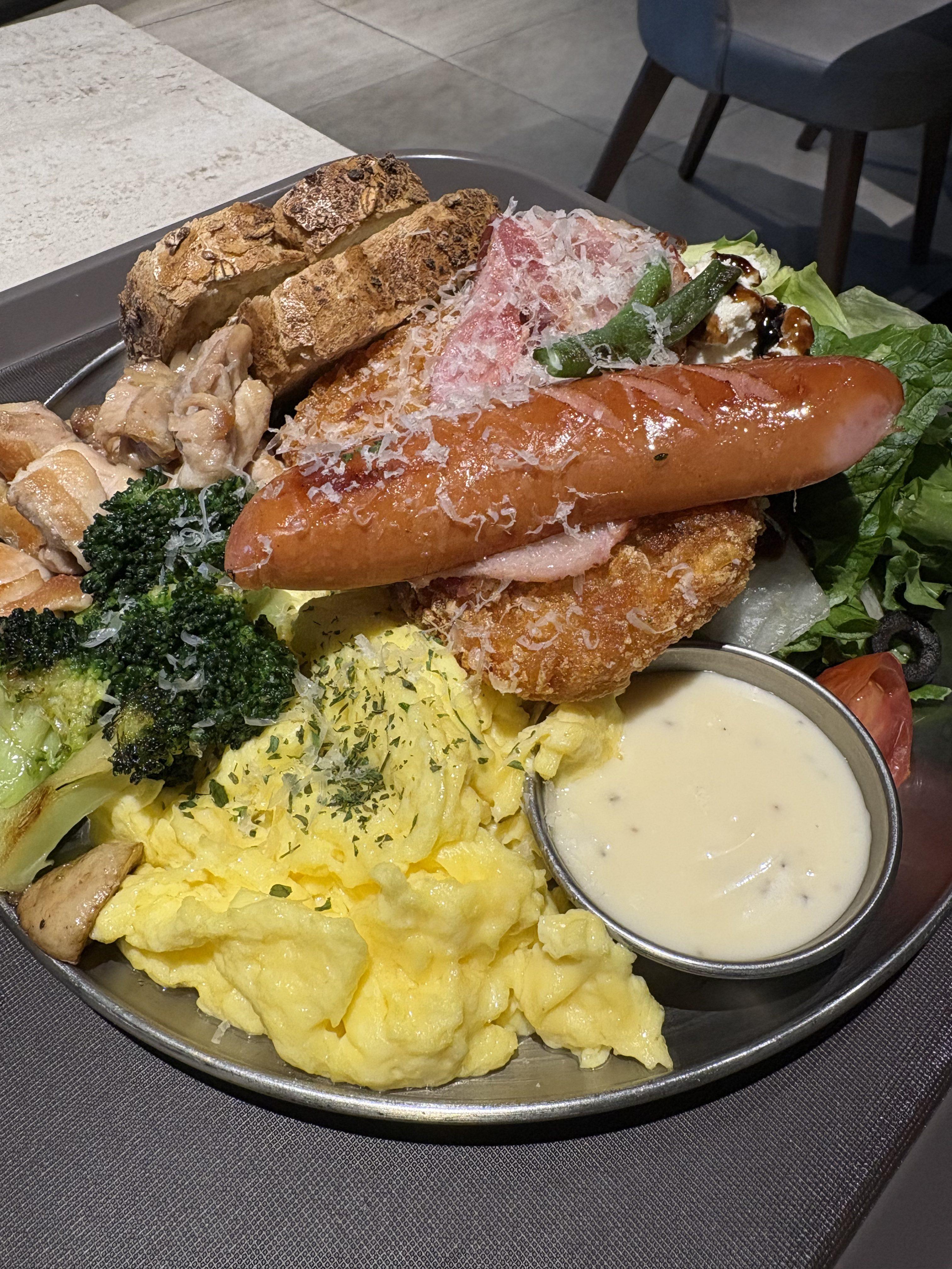 플래터엔 스크램블에그, 소세지, 해시브라운, 샐러드, 베이컨, 버섯, 브로콜리, 곡물빵 등이 들어있다.