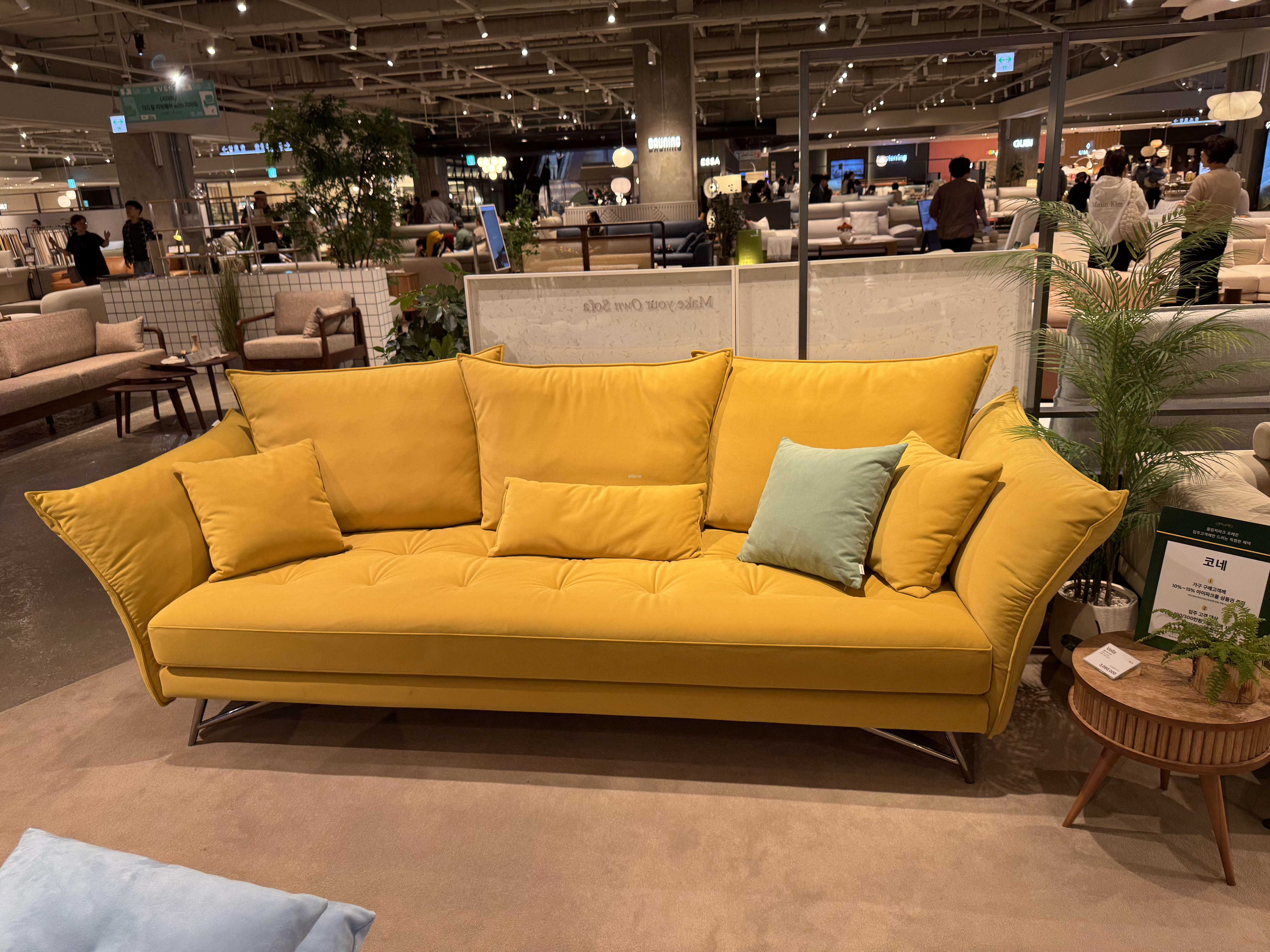 사진은 예전에 판교 현대백화점 매장에서 실물을 보고 예뻐보여서 찍어둔 모델이에요. 파스텔톤의 겨자색 일체형 소파이고, 모델명은 “카우프만 소파”였어요.