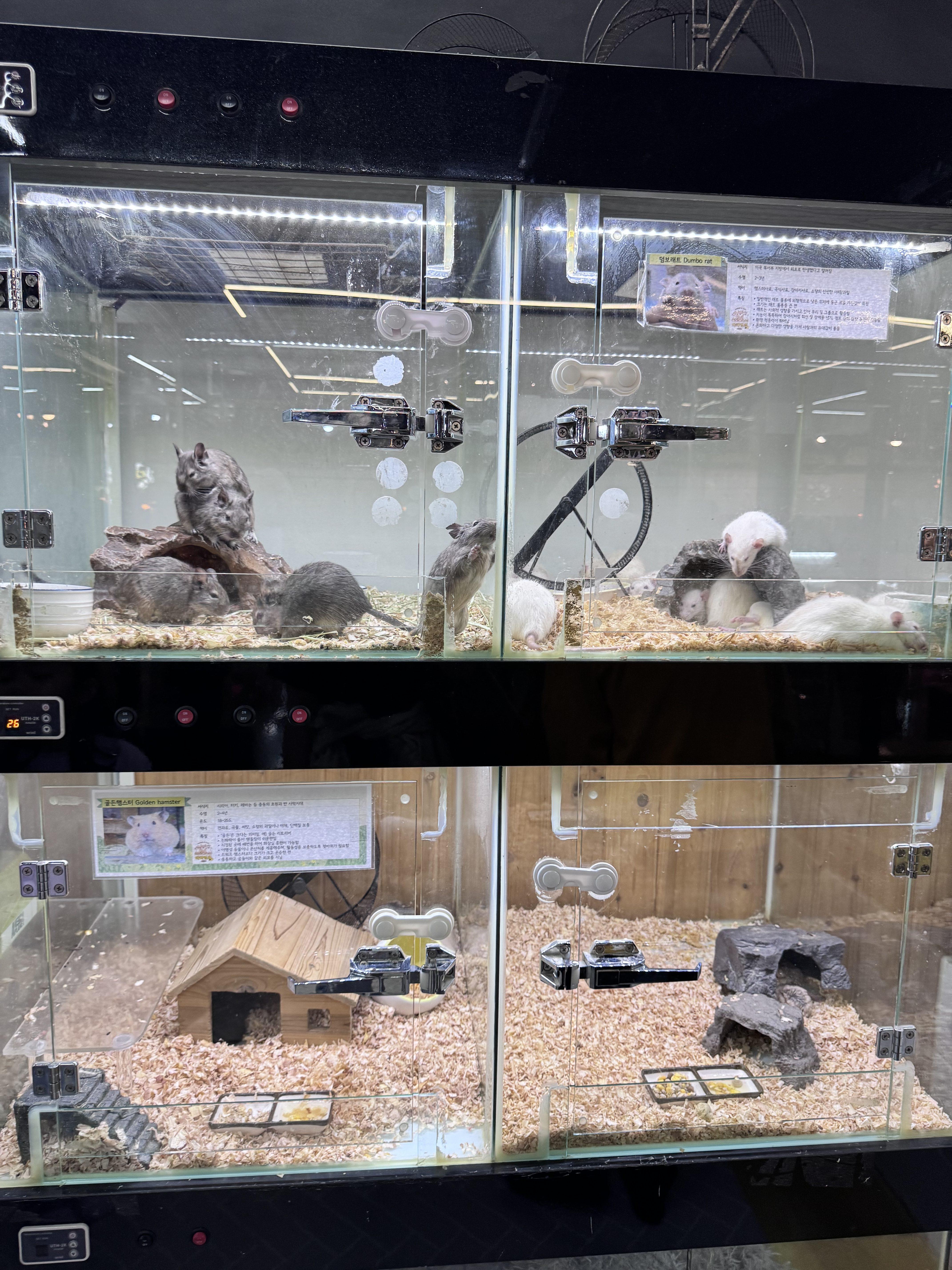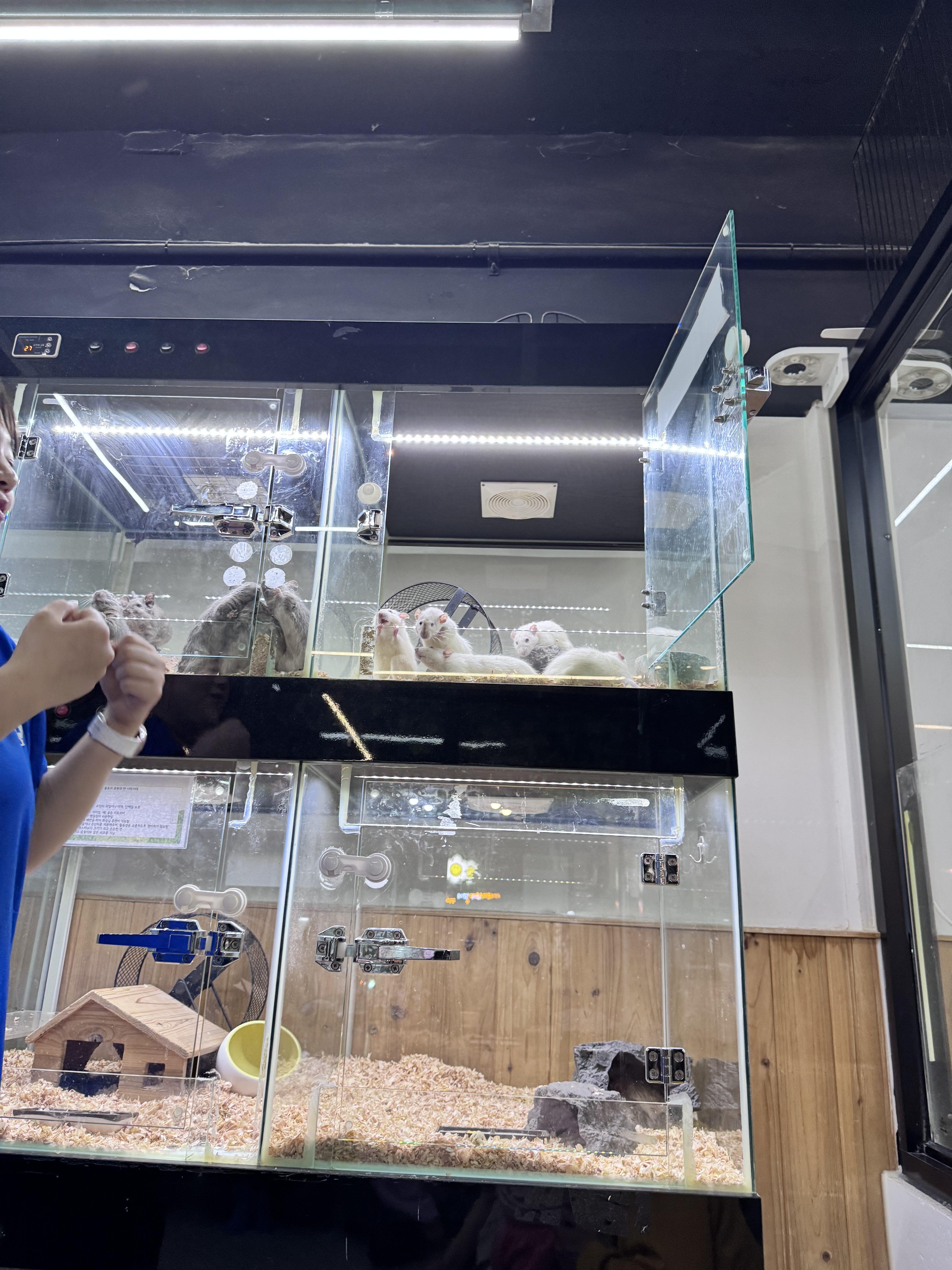 뱀이나 쥐는 케이지 안에 있었어요. 특정 시간대엔 직원 분이 체험학습처럼 동물의 특징을 설명해주고 만져보게 하기도 하셨구요.