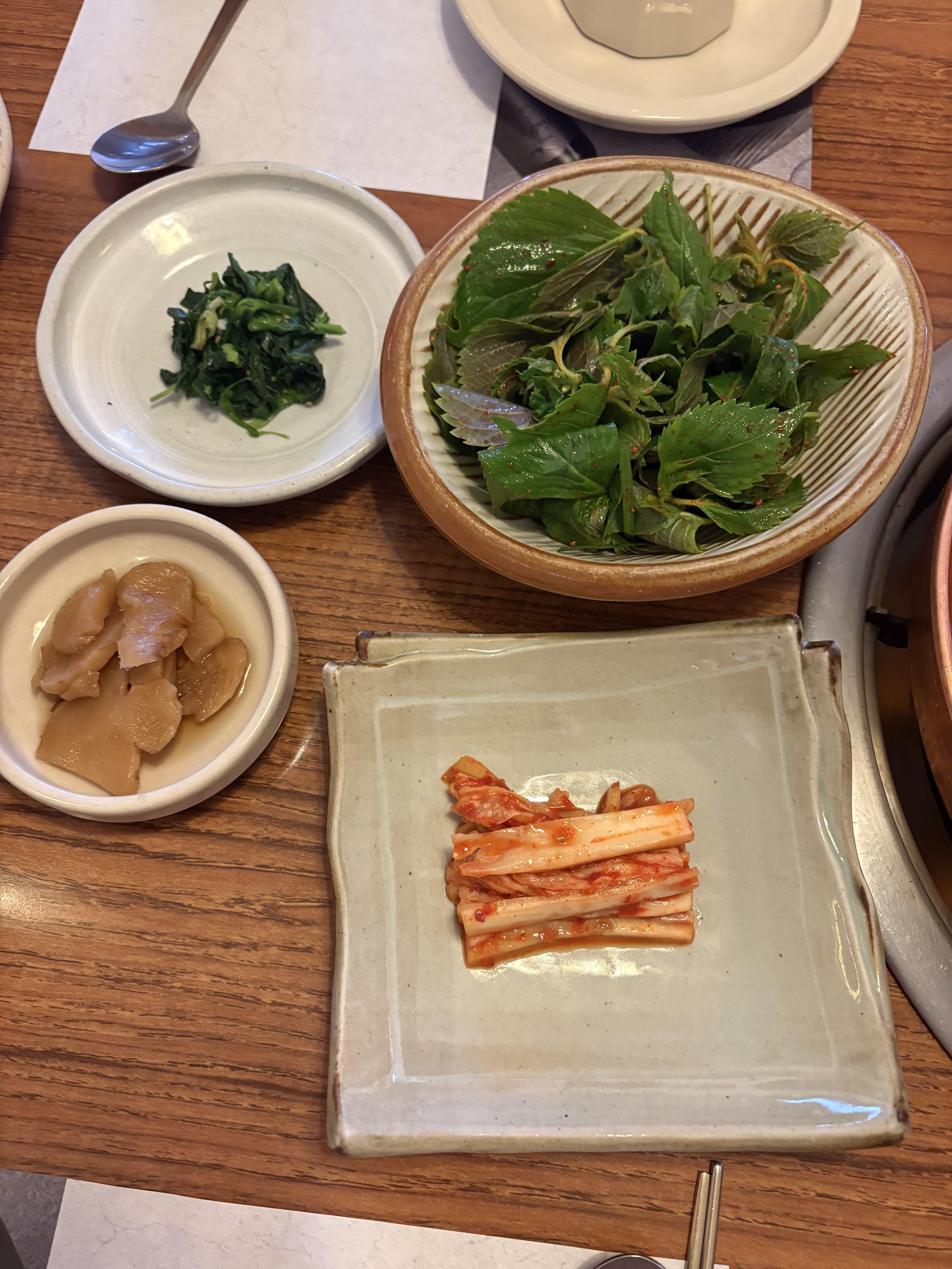주문하자마자 양념불고기를 굽는 판이 놓였고, 정갈한 반찬들이 계속 서빙되기 시작했어요.