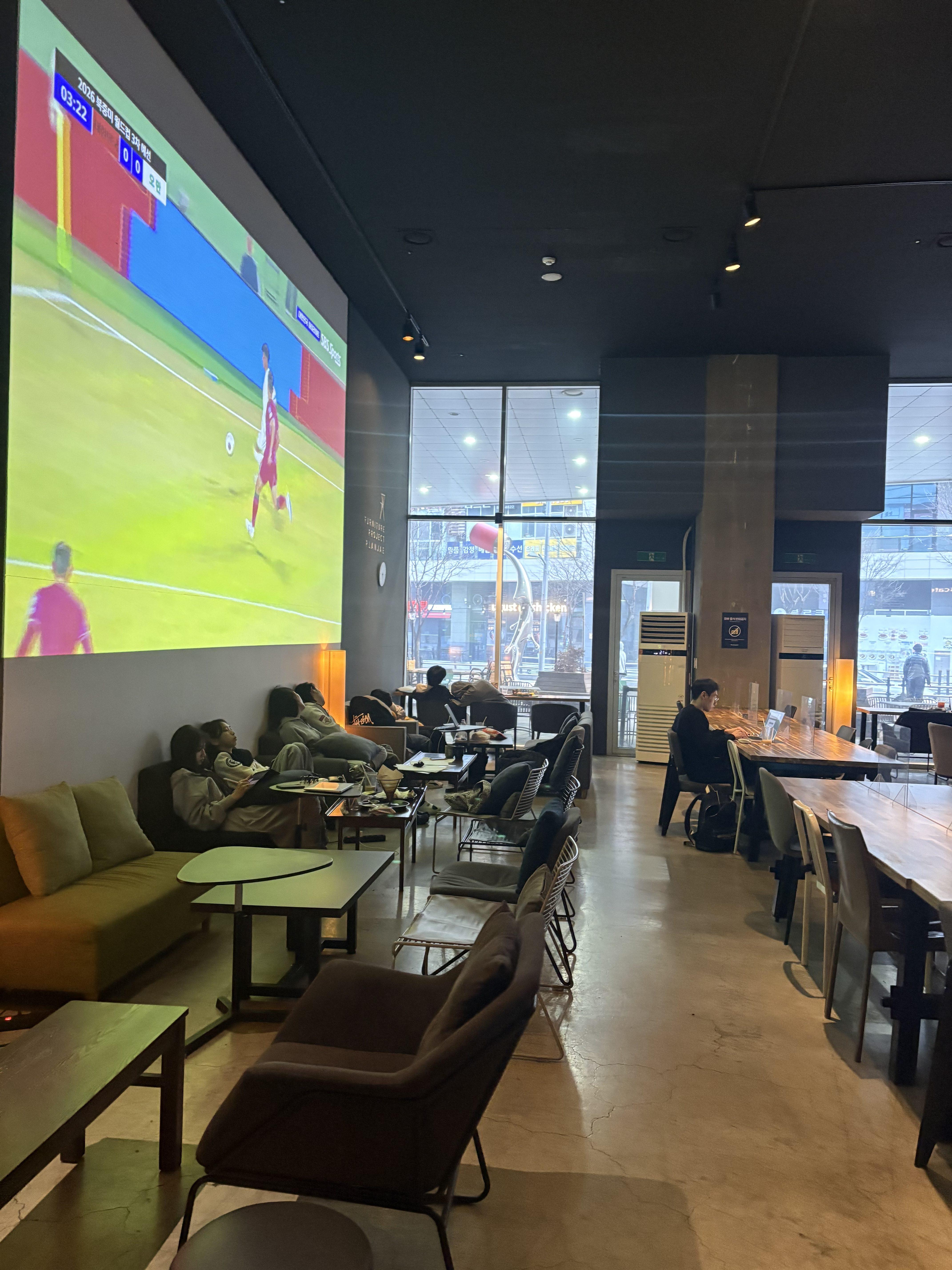한 쪽 벽면엔 축구경기가 보이는 영상도 재생되고 있었어요. 사람도 꽤 많았고요!