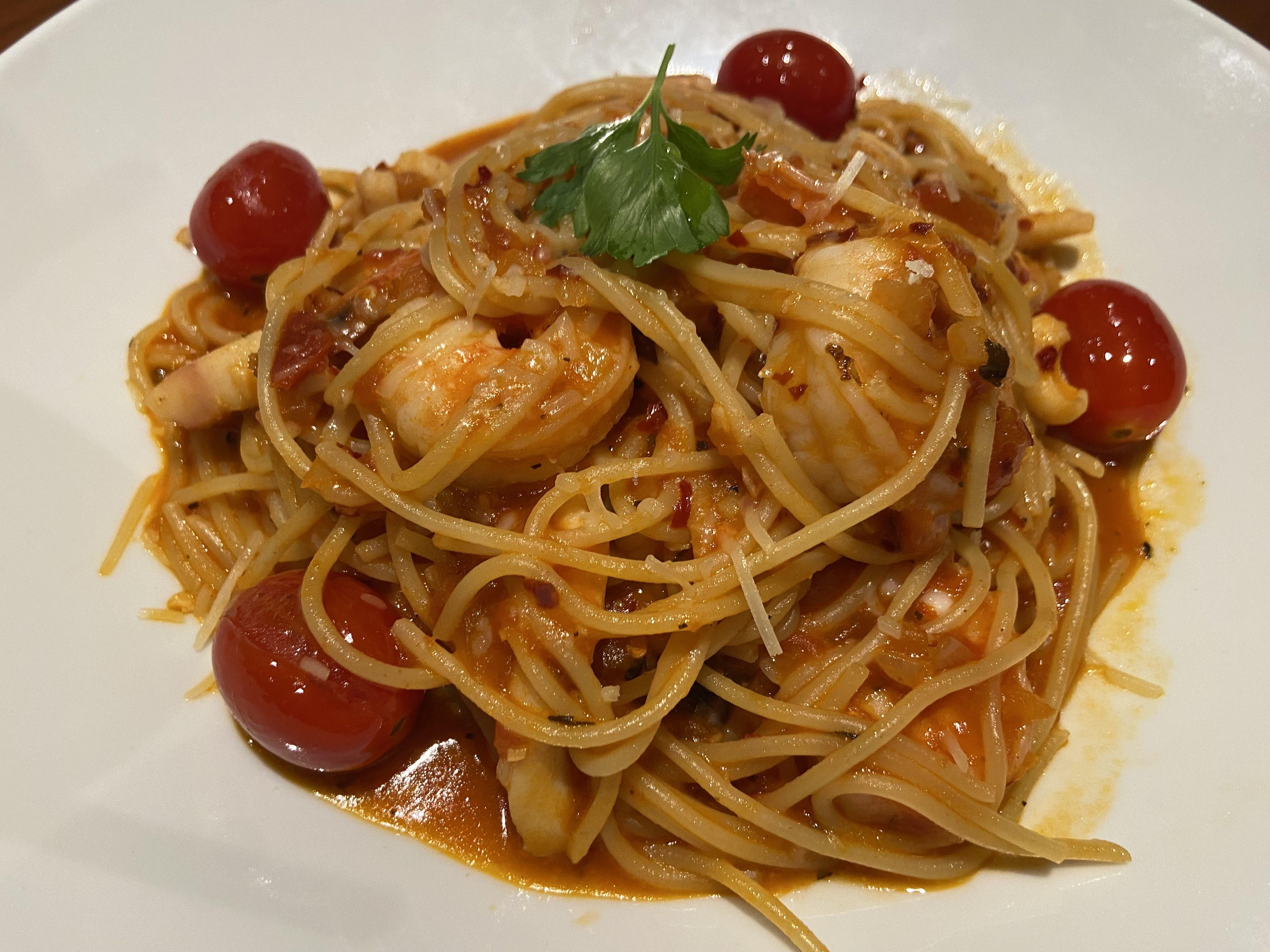 저는 약간 매콤한 맛이 느껴지는 토마토 소스 베이스의 해산물 파스타, 씨푸드 아라비아따를 주문했어요.