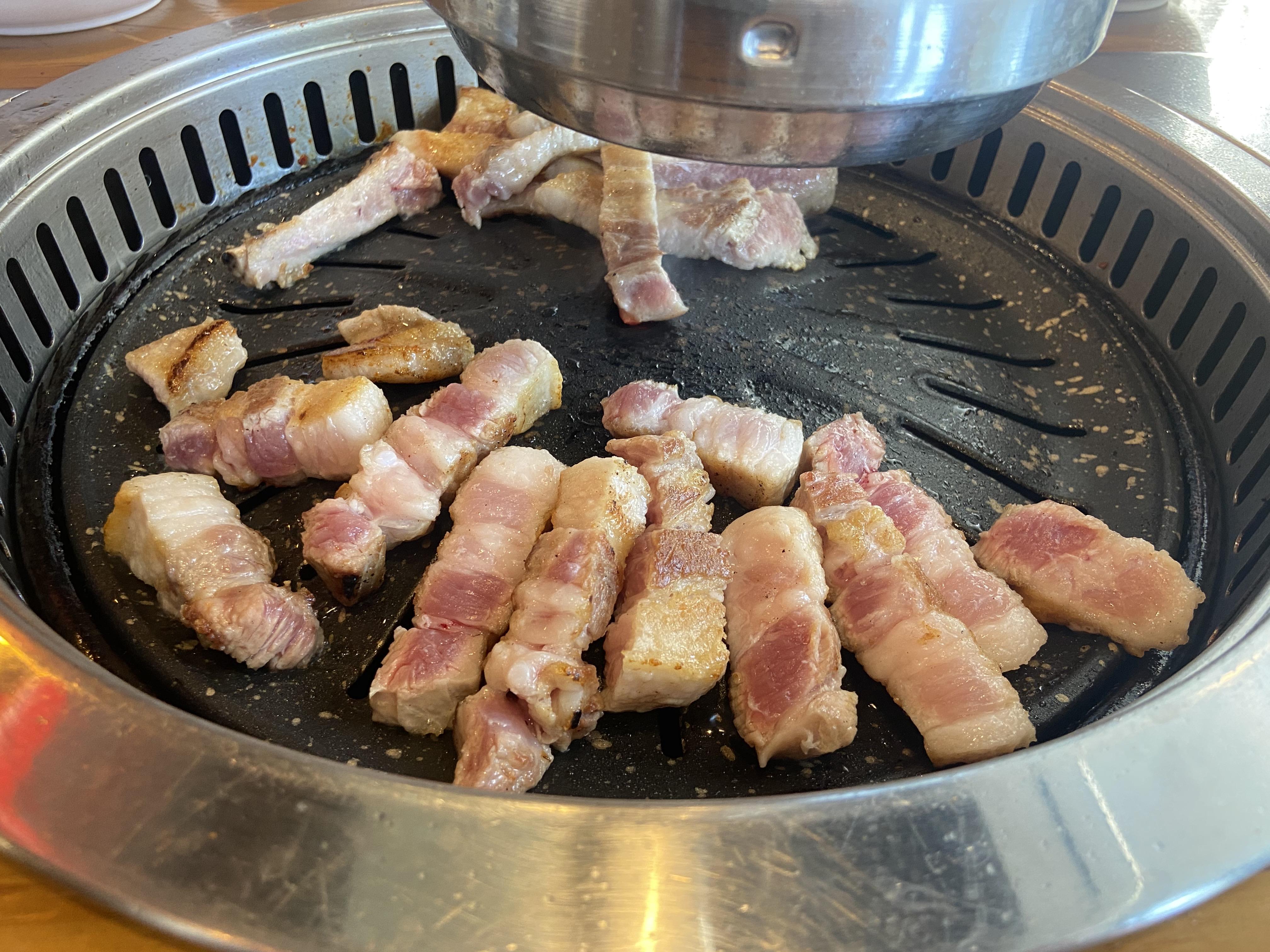 드디어 고기가 나왔다. 불판에 고기를 통으로 올리니 지글지글 소리도 나고 맛있는 냄새도 났다. 이 냄새 이 분위기 너무 좋다! 오랜만에 맛보는 불판 고기라니.. 좋구만.