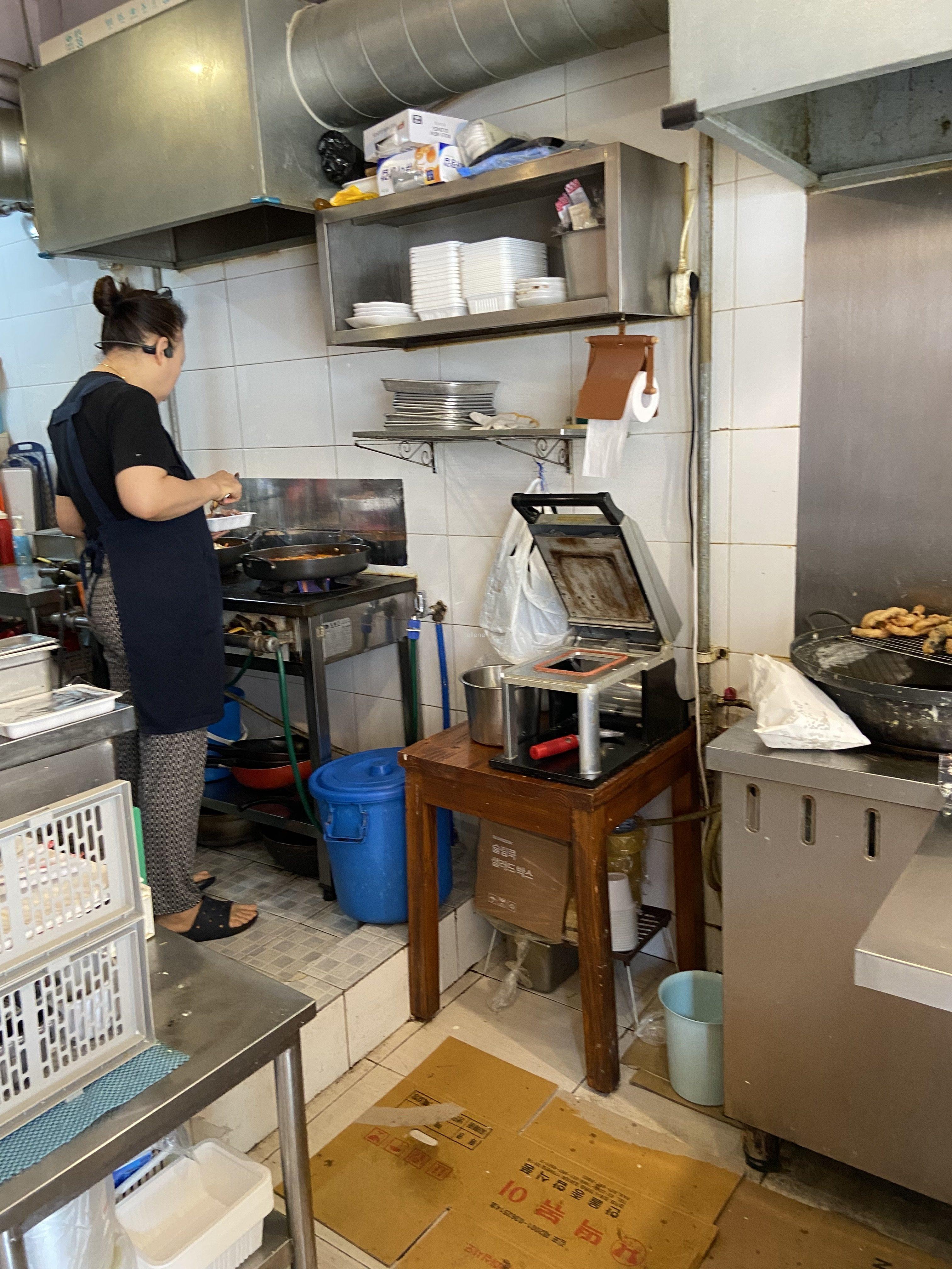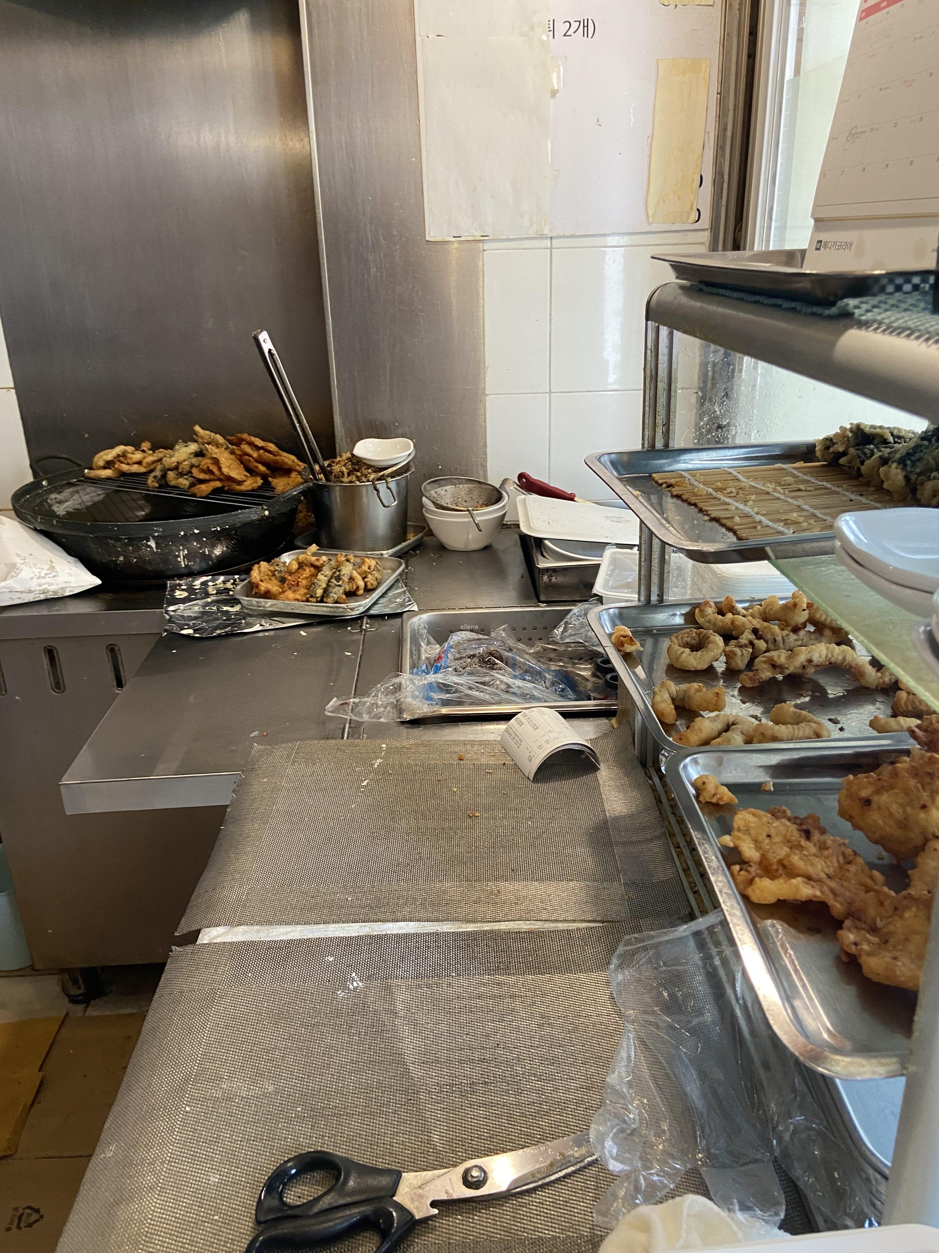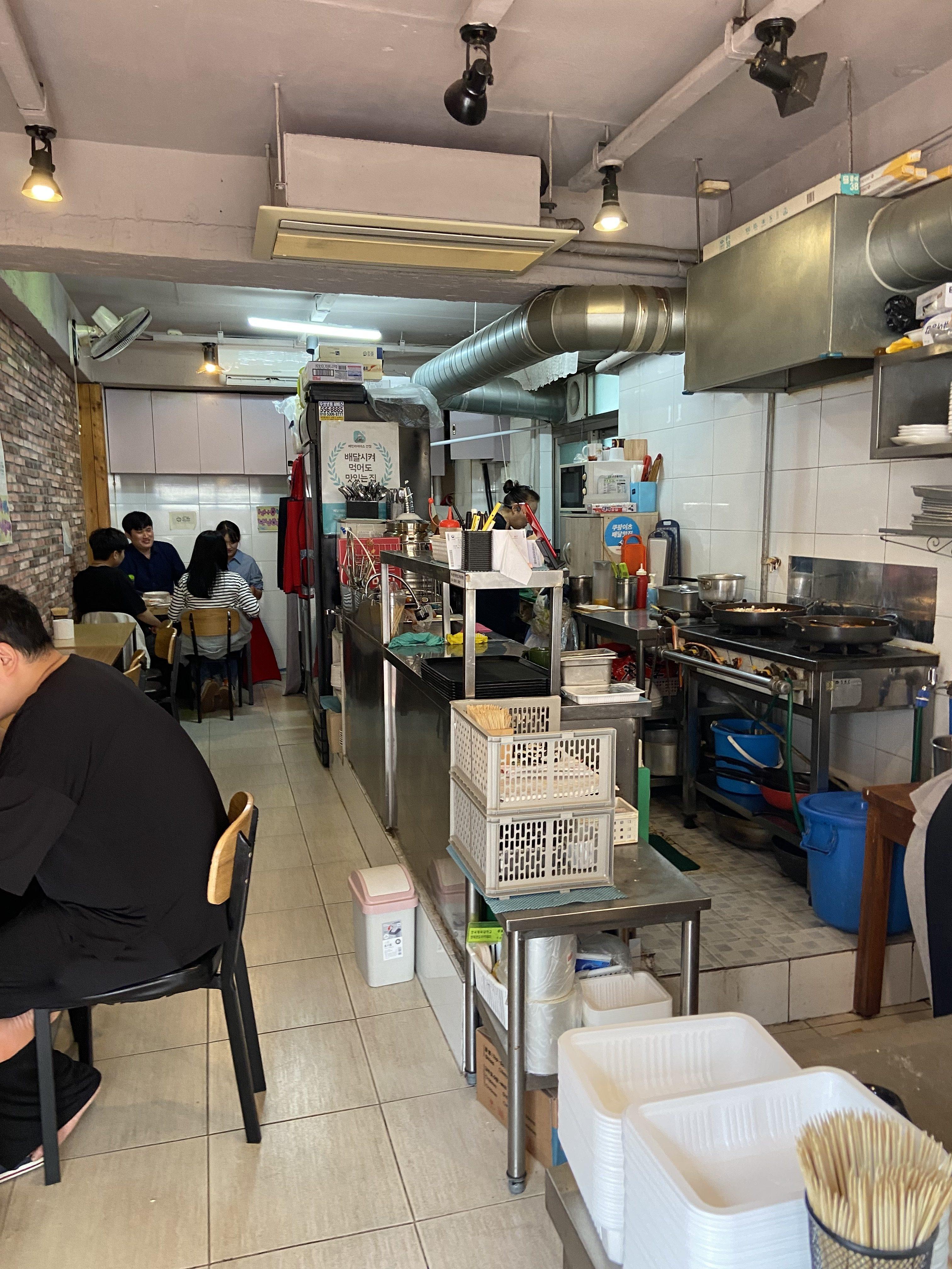 음식을 기다리는 동안 가게 안을 둘러봤다. 안쪽에는 두세명이 앉을 수 있는 테이블이 5~6개 정도 있고, 조리대와 카운터가 있다. 조리대에선 직원이 떡볶이를 계속 굽고 있었다. 여기 떡볶이가 약간 기름 떡볶이같은 질감의 밀떡이라는데, 그래서 이렇게 떡볶이를 직접 프라이팬에 굽나보다.