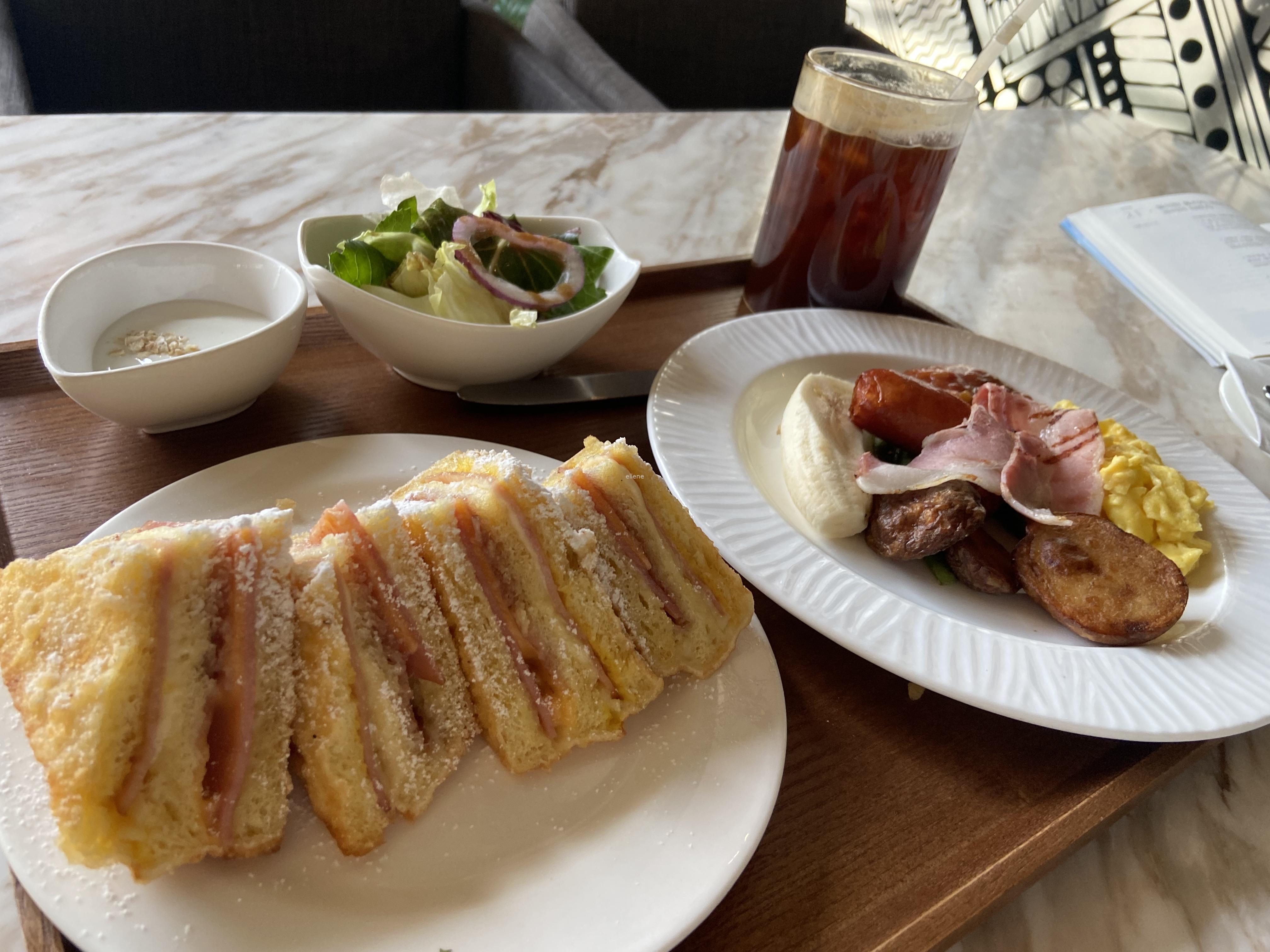 접시 하나엔 몬테크리스토 네 조각을 올렸고, 다른 접시엔 감자 세 조각, 스크램블 에그, 바나나, 소세지, 아스파라거스, 베이컨으로 구성된 브런치 세트가 놓였다.