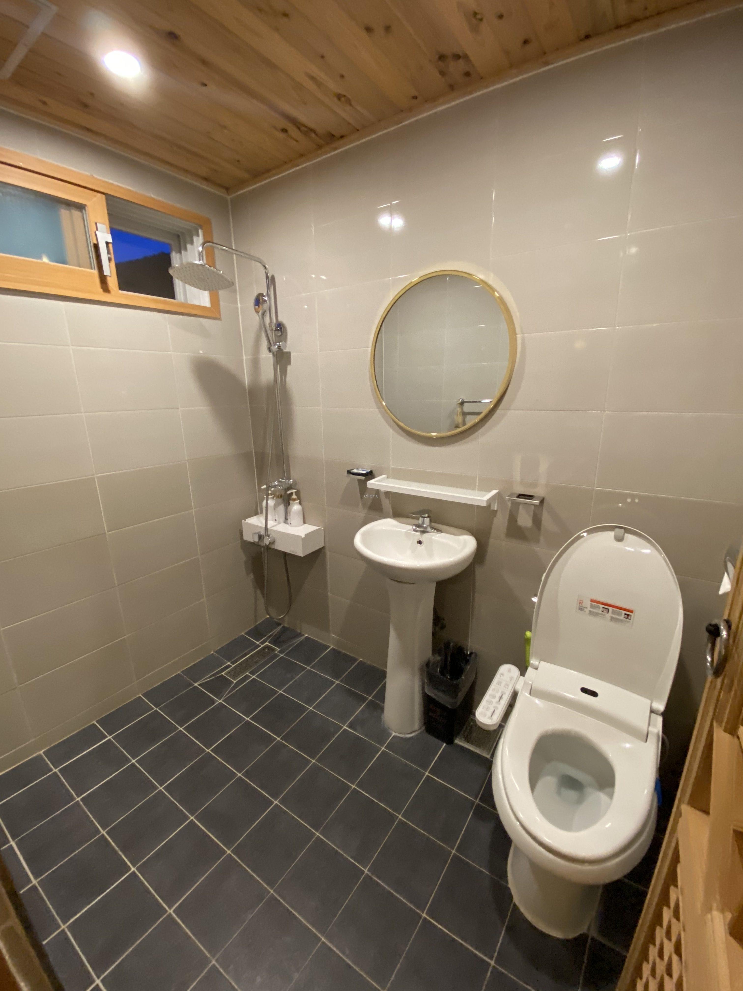1층 화장실엔 욕조가 없다. 변기, 세면대, 샤워기, 이렇게 딱 필요한 핵심 요소만 갖춰져 있고 끝.