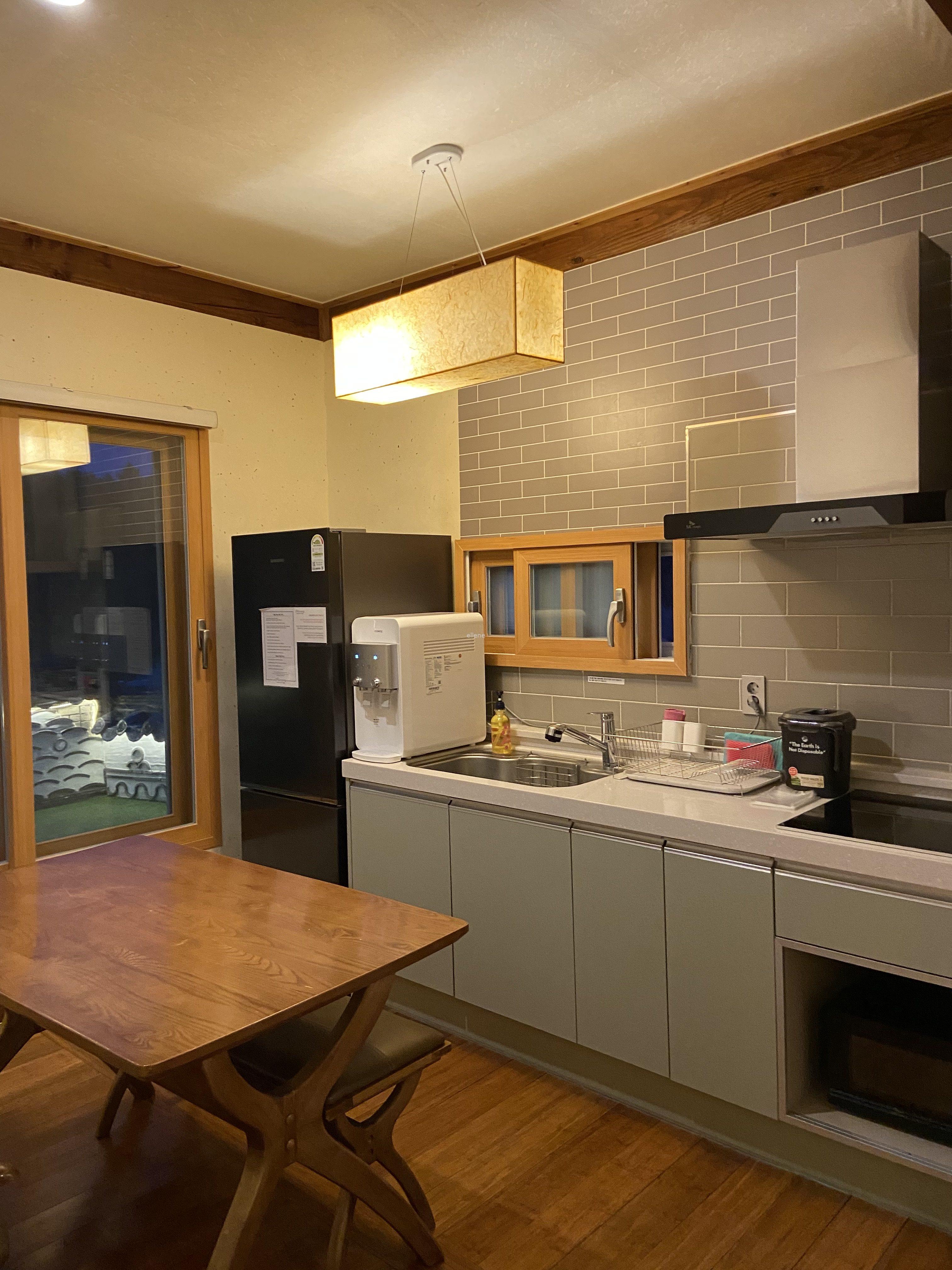 주방엔 기본적인 조리도구와 밥솥, 냉장고, 정수기 등이 있다. 가장 유용하게 쓴 건 정수기다. 여행을 갈 땐 항상 물이 부족하지 않도록 충분히 사가야 해서 무게가 부담이 되는데, 여행지에 정수기가 있으니 굳이 생수를 사가지 않아도 시원한 물을 양껏 마실 수 있어 참 편했다.