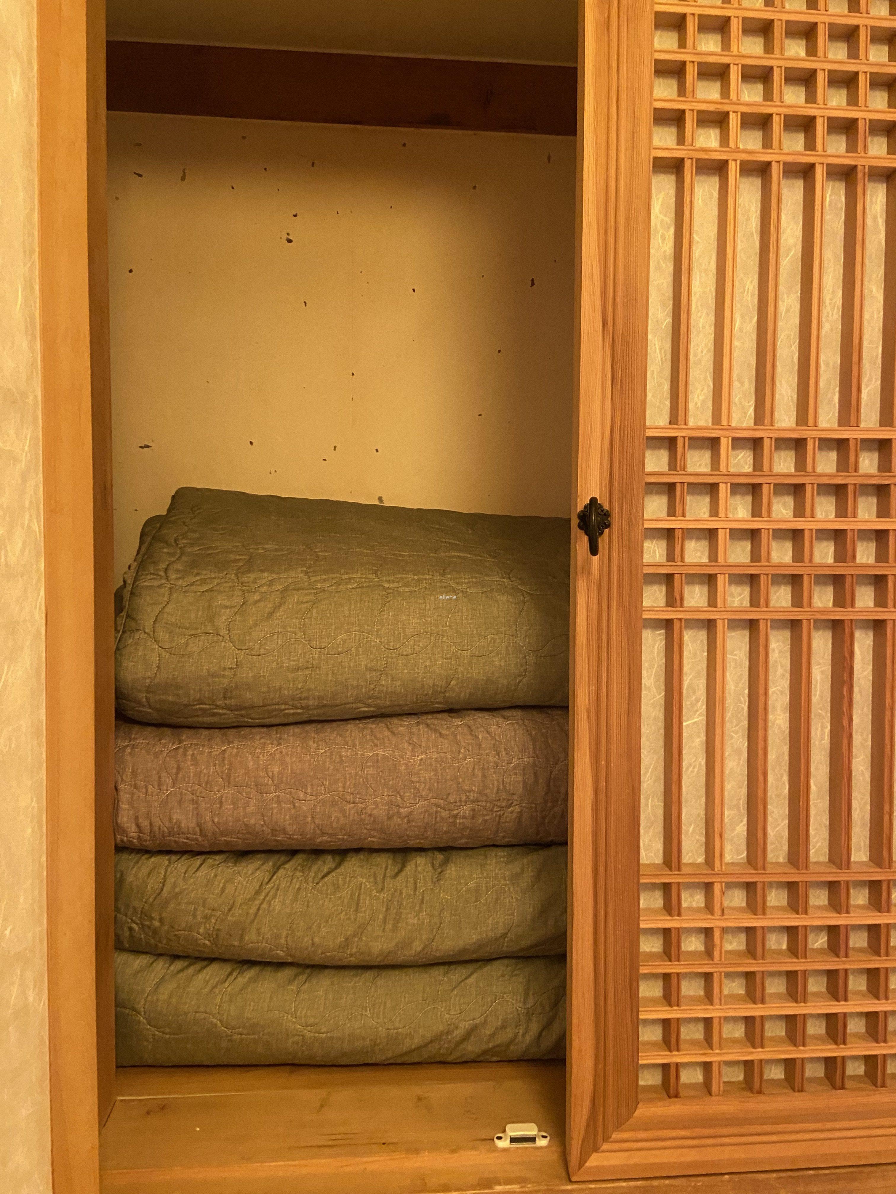 침대 뒤 쪽 벽에는 요와 이불이 들어있는 옷장이 있다. 이 곳에서 요와 이불을 꺼내 온돌방에 펼쳤더니 바닥이 약간 폭신폭신해졌다.