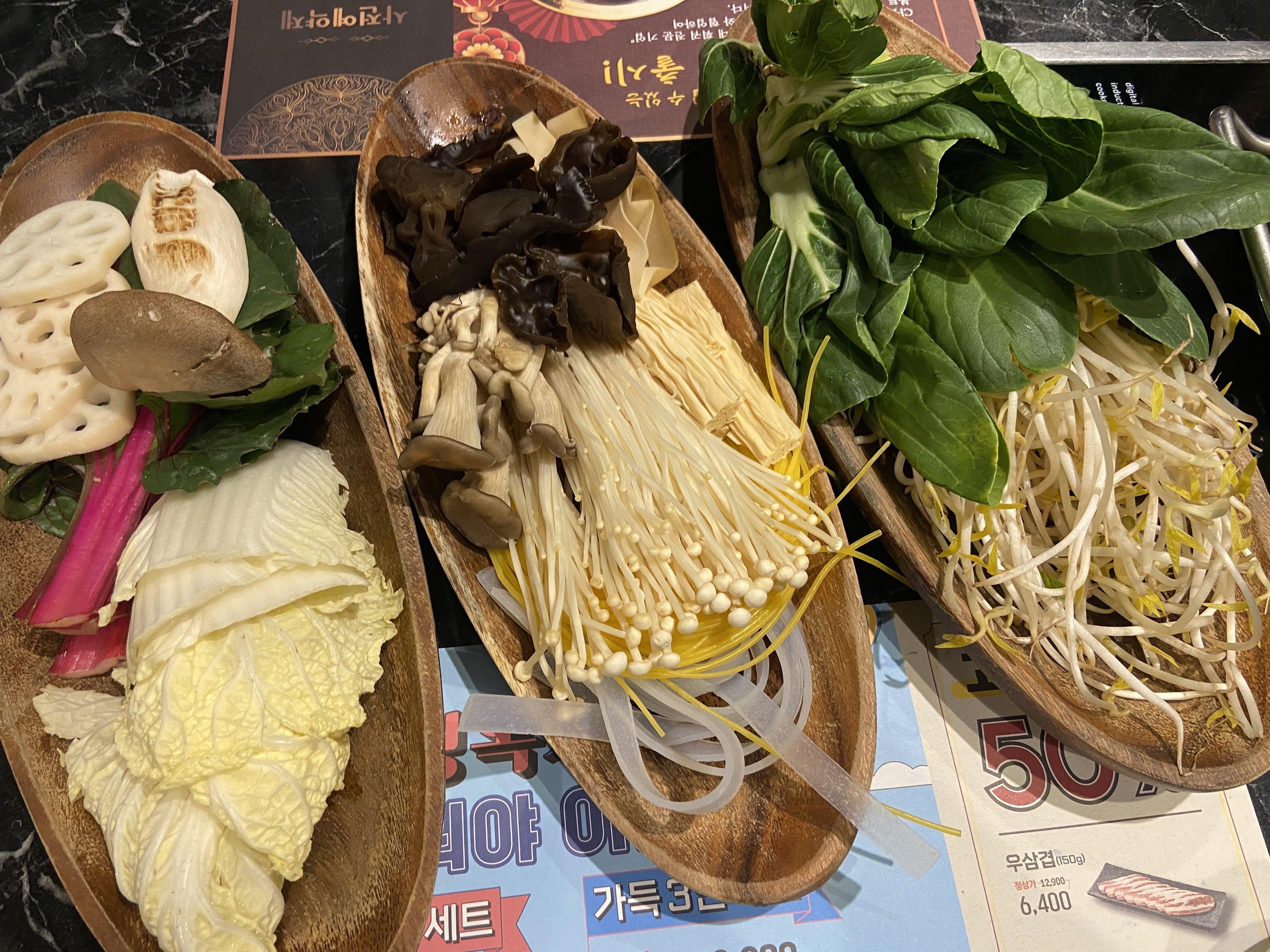 다음, 야채모듬, 소고기, 꿔바로우, 면도 각기 다른 접시에 담겨 제공됐다. 꿔바로우는 양이 아주 적었다. 정말 샤브샤브 먹으면서 아주 조금 맛만 보기 좋을 정도로 적은 양이었다. 그래서 우리 부부는 오히려 더 좋았다. 평소에 꿔바로우를 주문하면 처음엔 맛있게 먹다가도 그 특유의 단 맛에 질려서 결국 반 이상을 남겨버리는데, 훠궈야에선 아예 처음부터 적은 양만 줘서 질리지 않고 맛있게 다 먹어치웠으니까.
