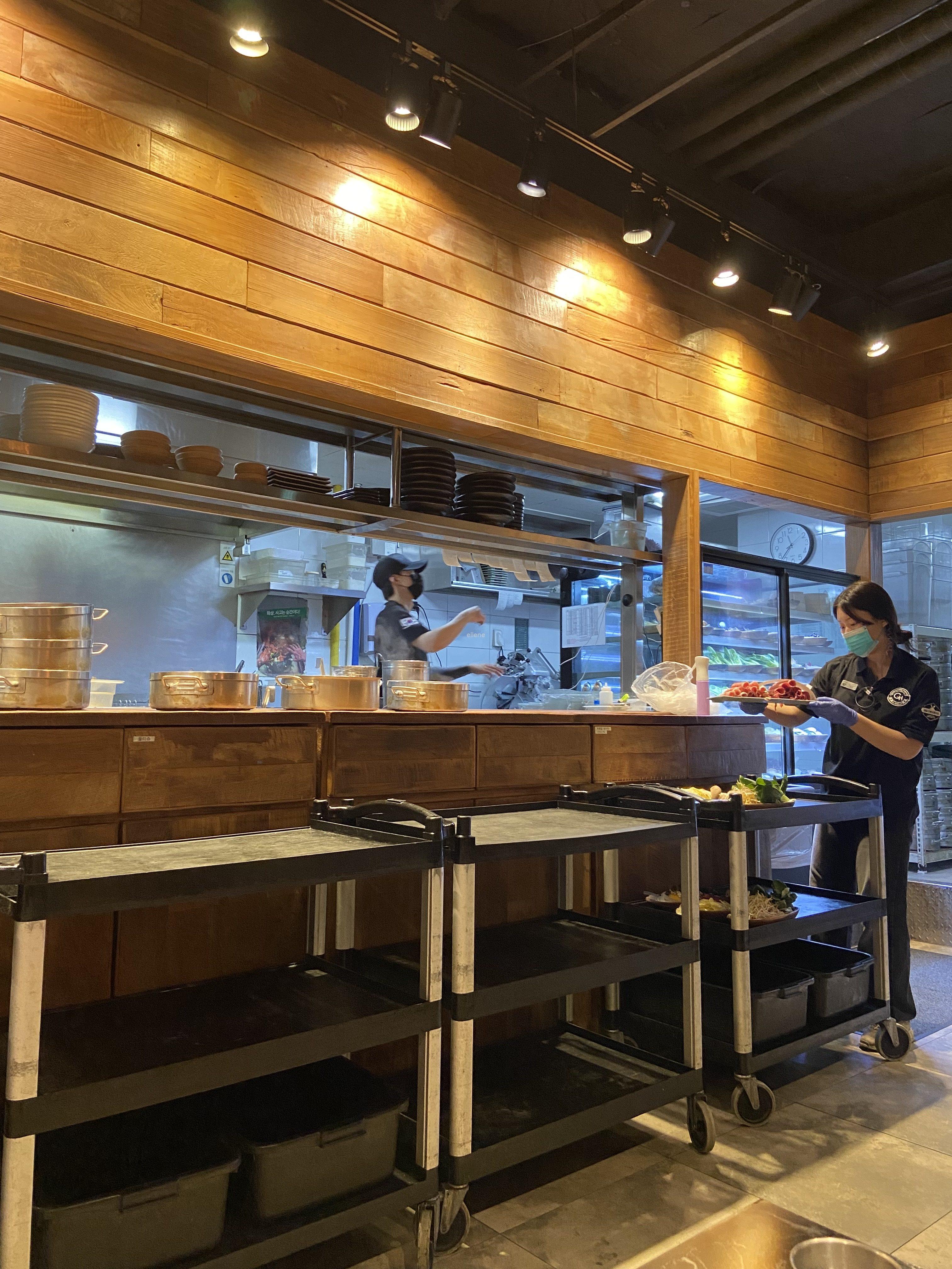 소스를 만들고 있을 때 직원이 음식을 테이블로 가져다주셨다.