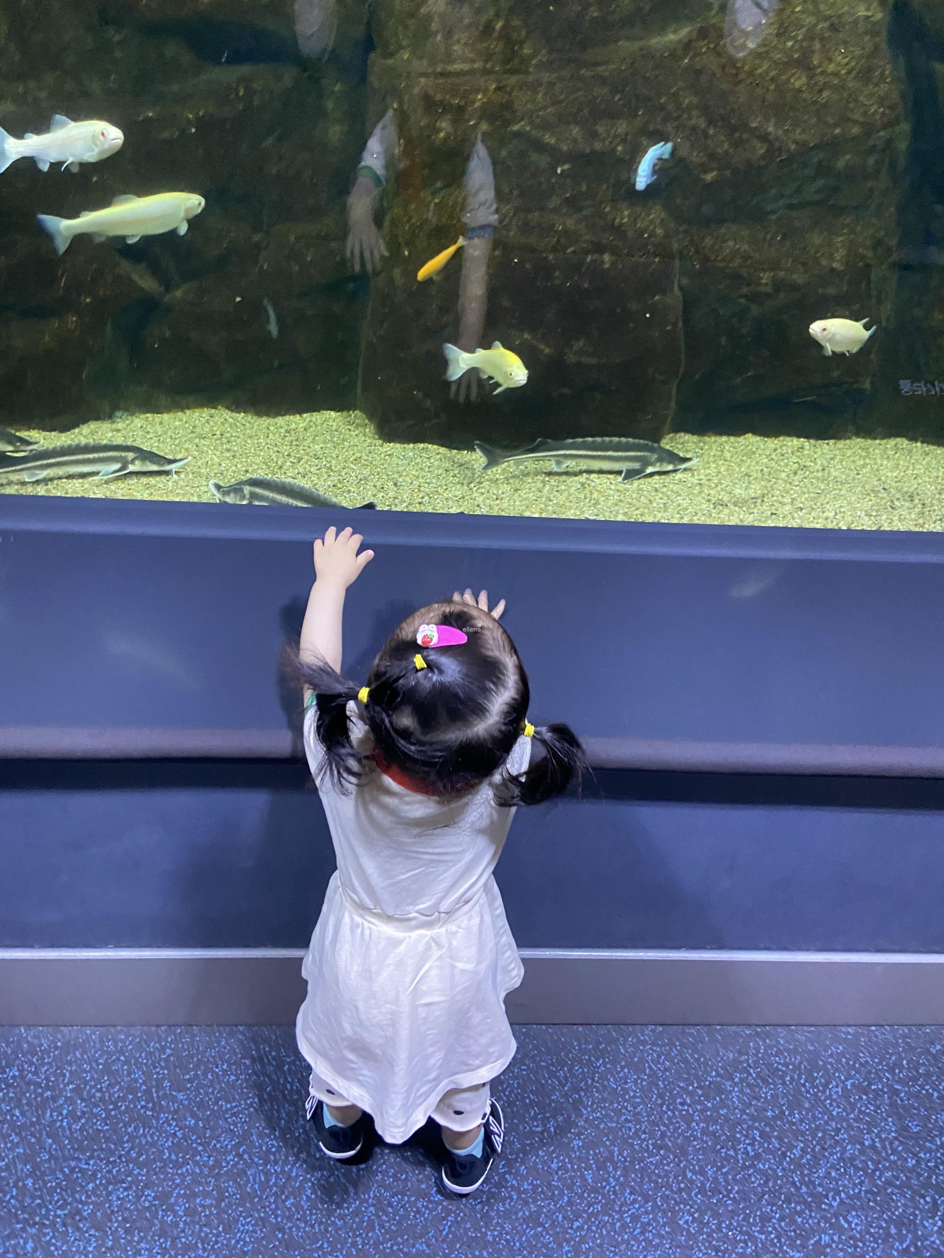우리 아기는 이렇게 바닥에 서서 고개를 들어 물고기를 구경했다.