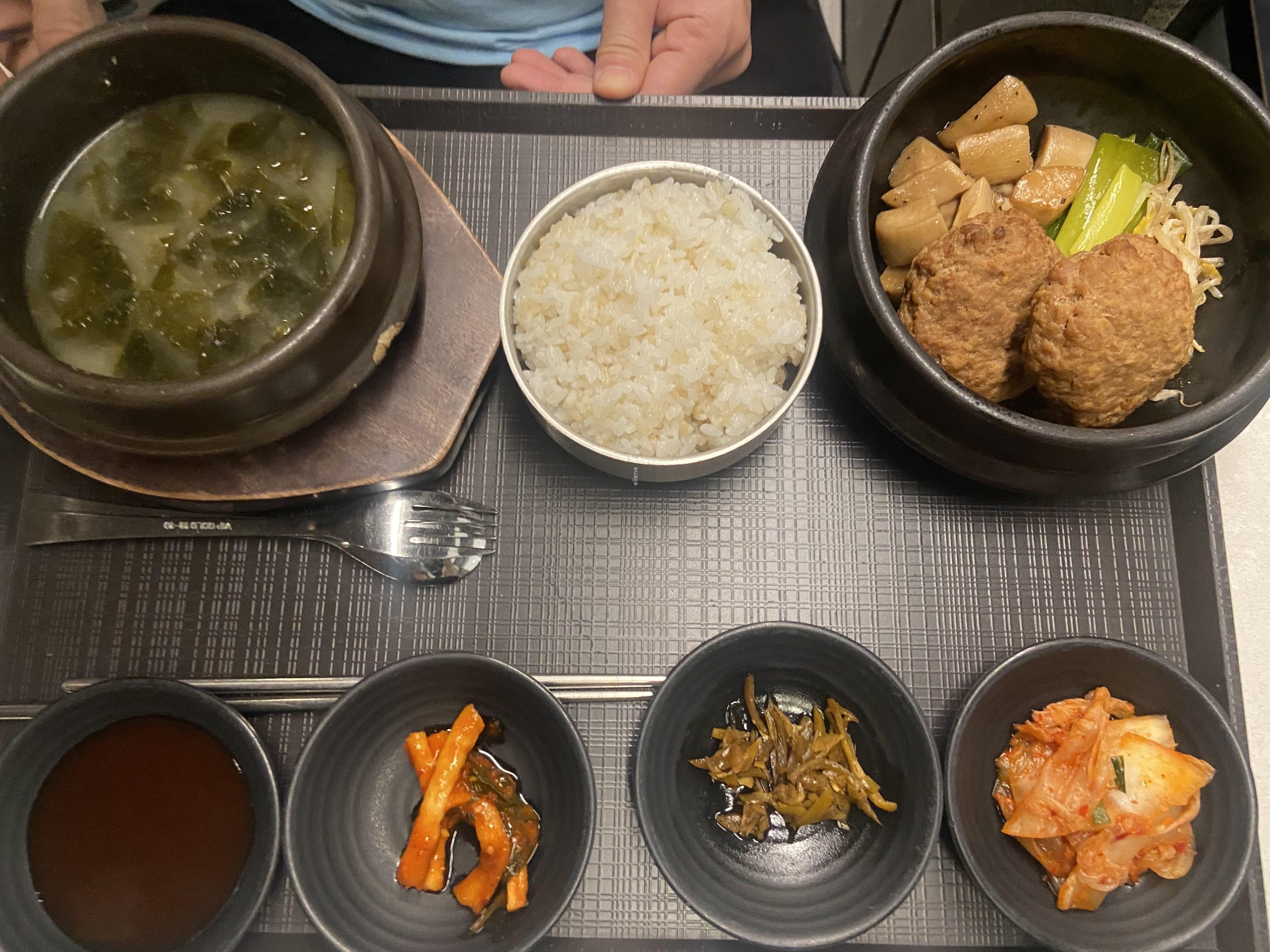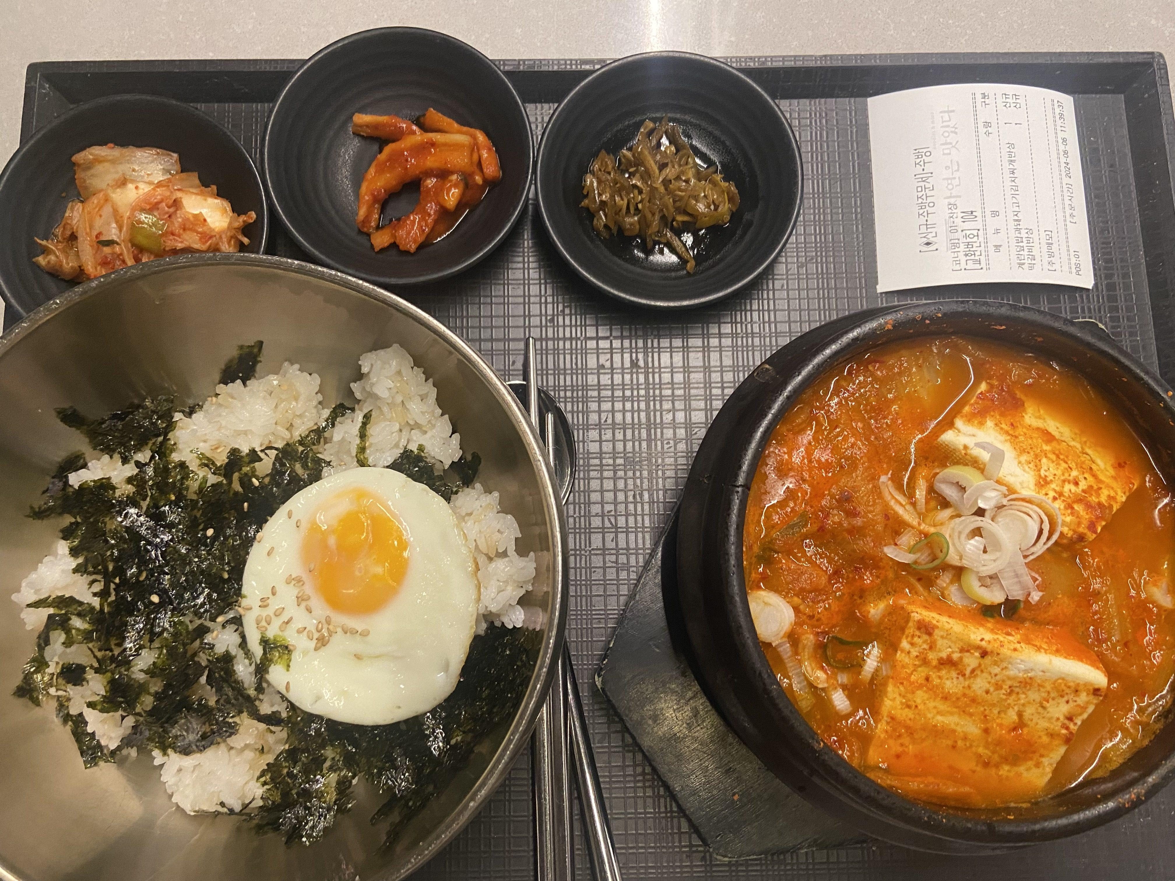 우리가 주문한 김치찌개와 미역국+돈가스 세트. 맛은 그냥 그랬다. 음식을 오래 기다리지 않아도 되고 좌석 자리잡는 경쟁을 안해도 되는 건 분명한 장점이었지만, 음식의 맛과 종류는..잘 모르겠다.