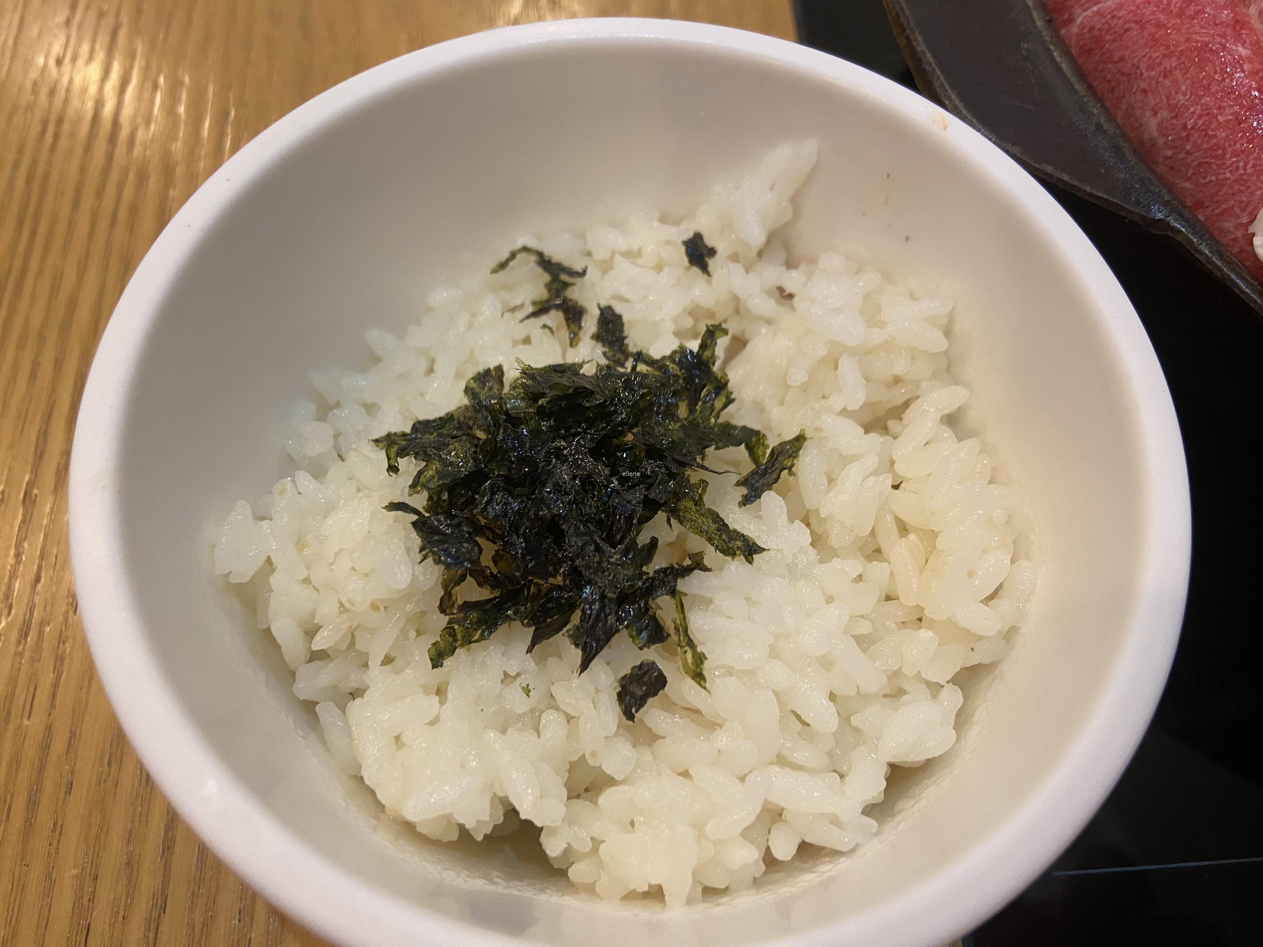 요 밥은 일반 공기밥이 아니다. 김가루와 작은 김치, 깻잎도 포함된 스키야키 볶음밥 전용 밥이다.