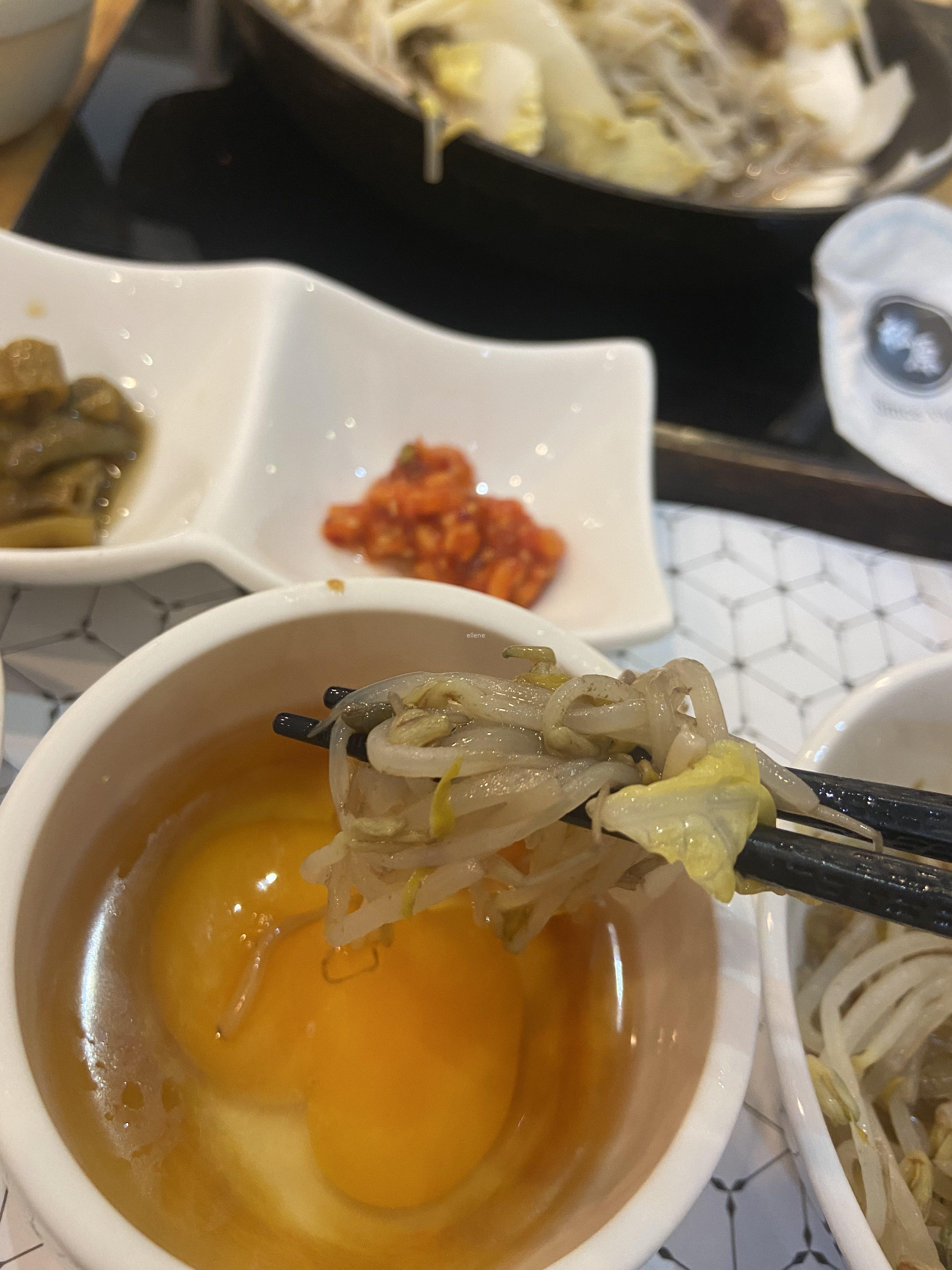 먼저 야채가 익도록 센 불에 푸르르 끓였다. 야채 숨이 죽었을 때 인덕션을 2~3정도로 맞춘 다음, 익은 고기와 배추를 달걀에 푹 담가 먹었다. 역시나 기대했던대로 고소하고 달큰한 맛이 느껴진다.