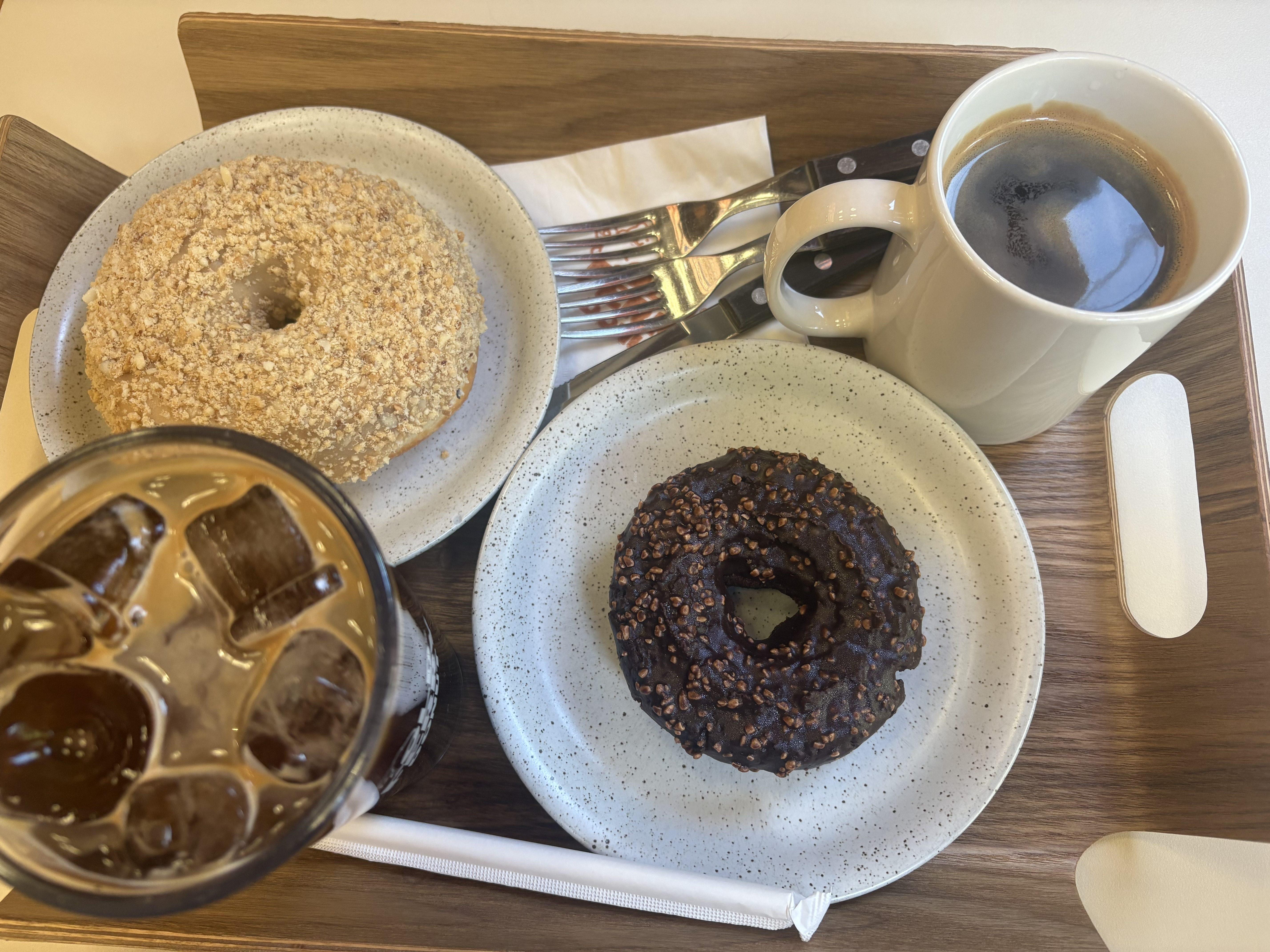 저는 커피 두 잔과 피넛버터 도넛, 그리고 초코크런치 도넛을 주문했어요.