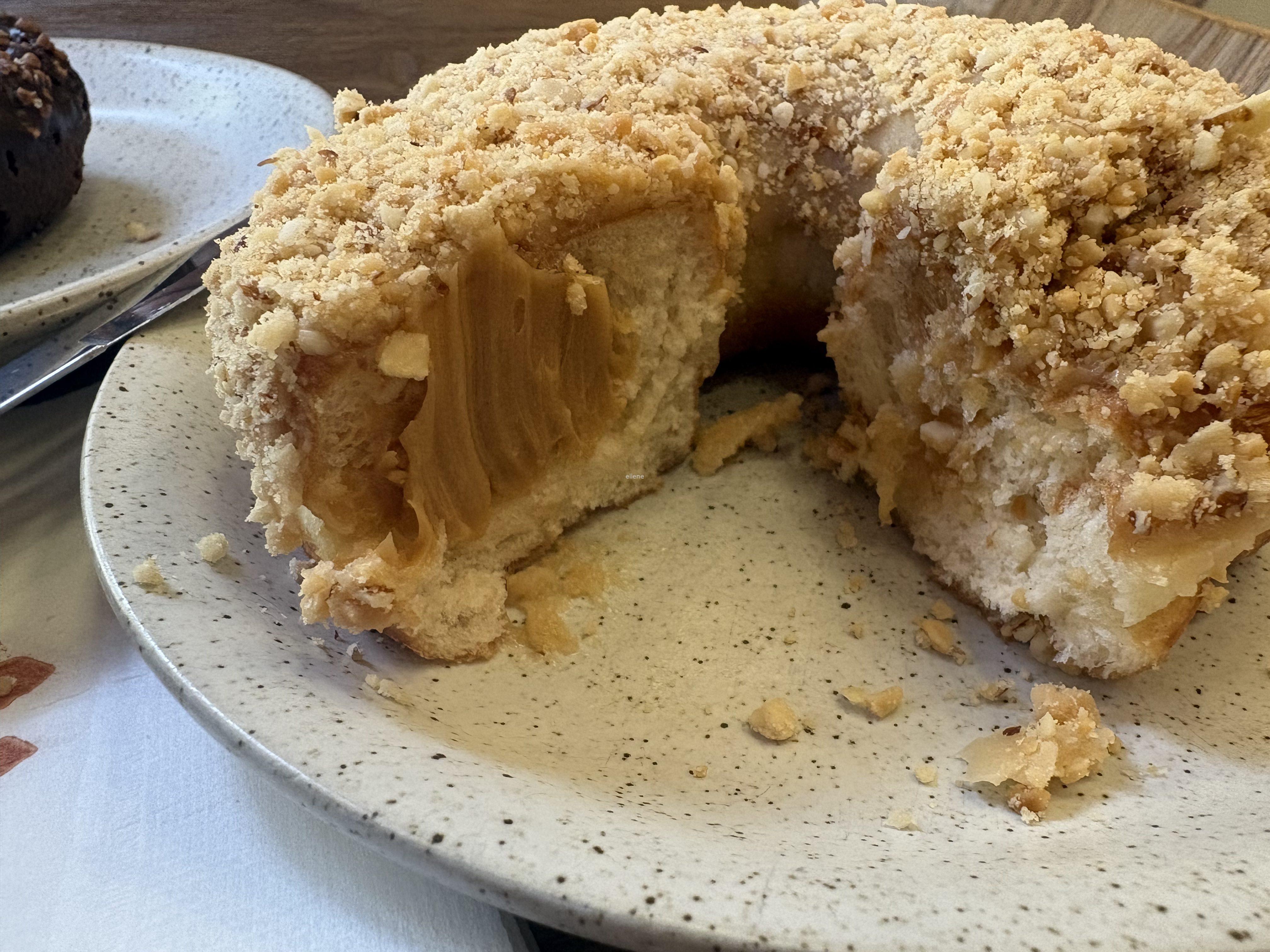 나이프로 잘라 단면을 보니 도넛 안쪽에서 피넛버터잼이 가득 흘러내리더라고요.