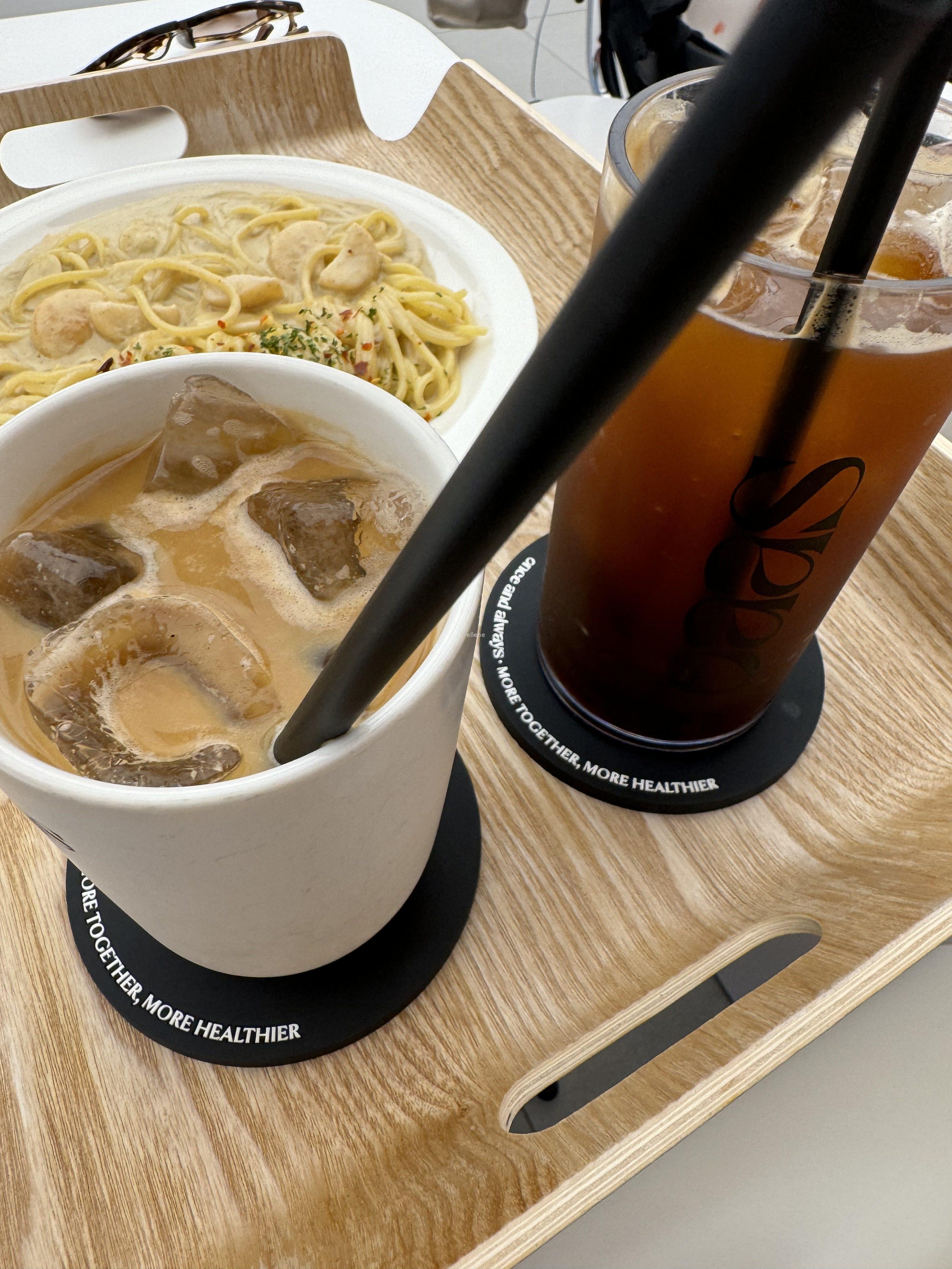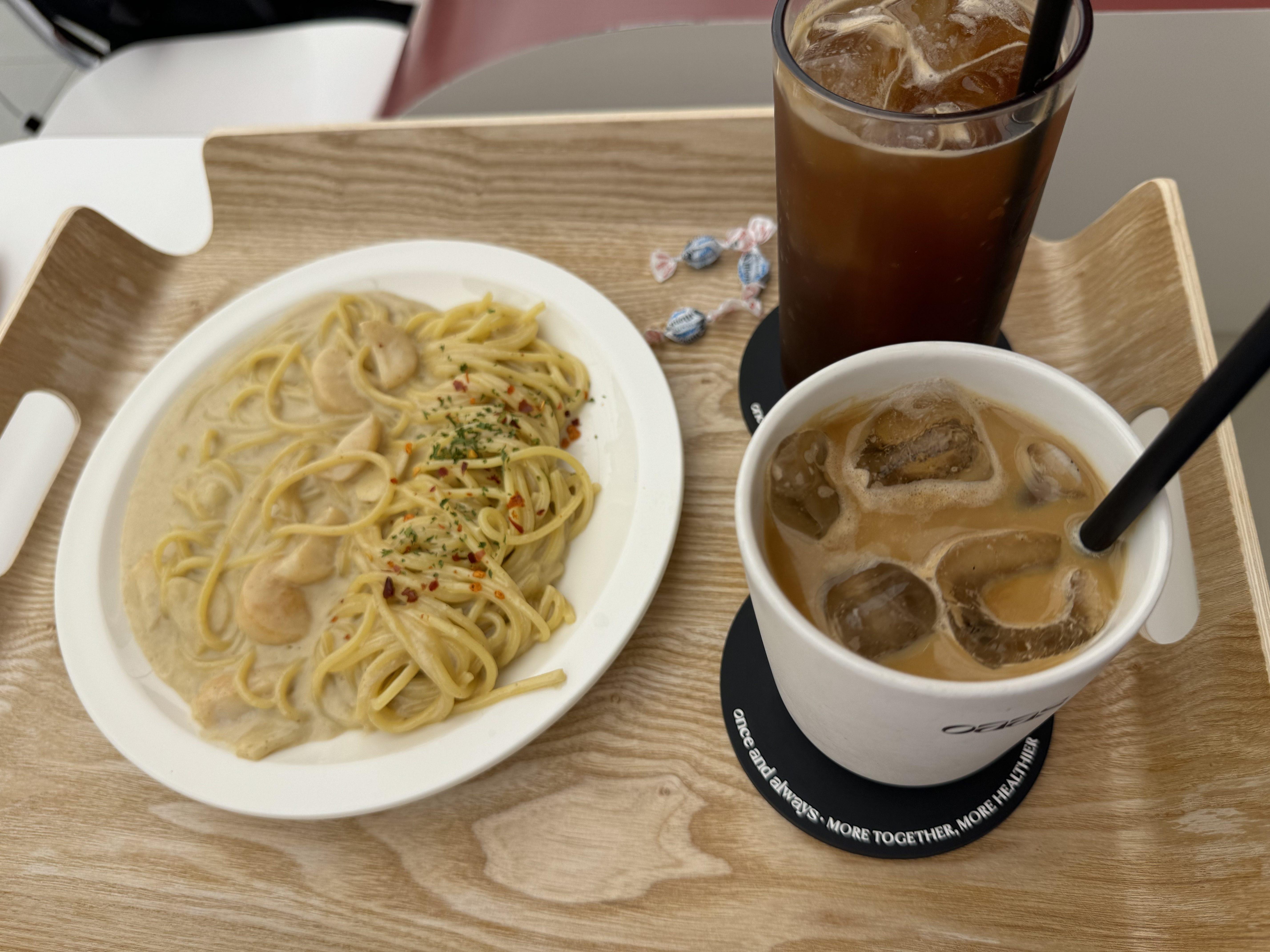 우리가 주문한 메뉴가 나왔어요! 아이스아메리카노 한 잔, 아이스 라떼 한 잔, 그리고 게살 내장 파스타 한 그릇.