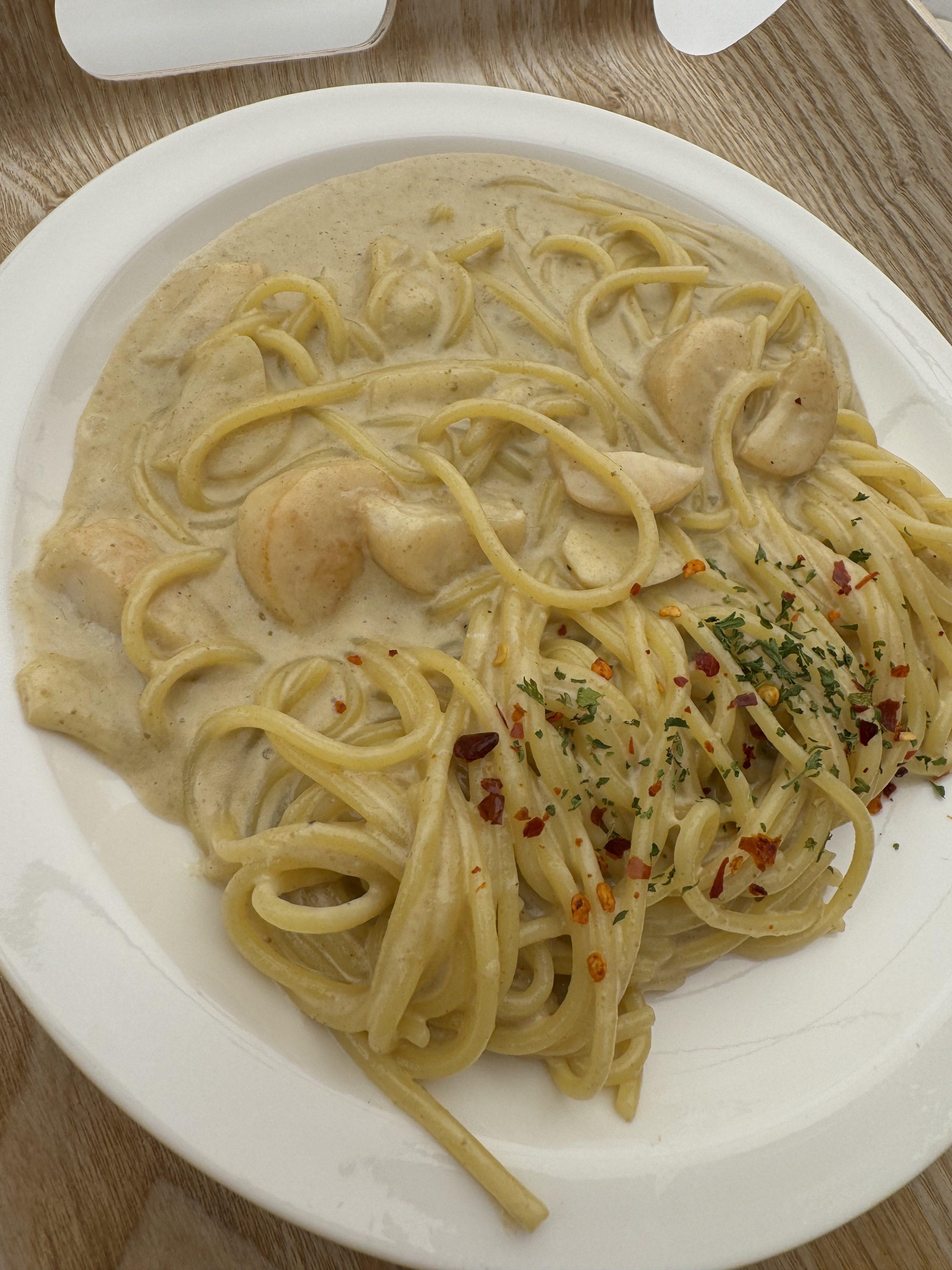 게살 내장 파스타는 게살 맛이 느껴지는 크림 베이스의 파스타예요. 아주 약간 매콤한 맛이 납니다.
